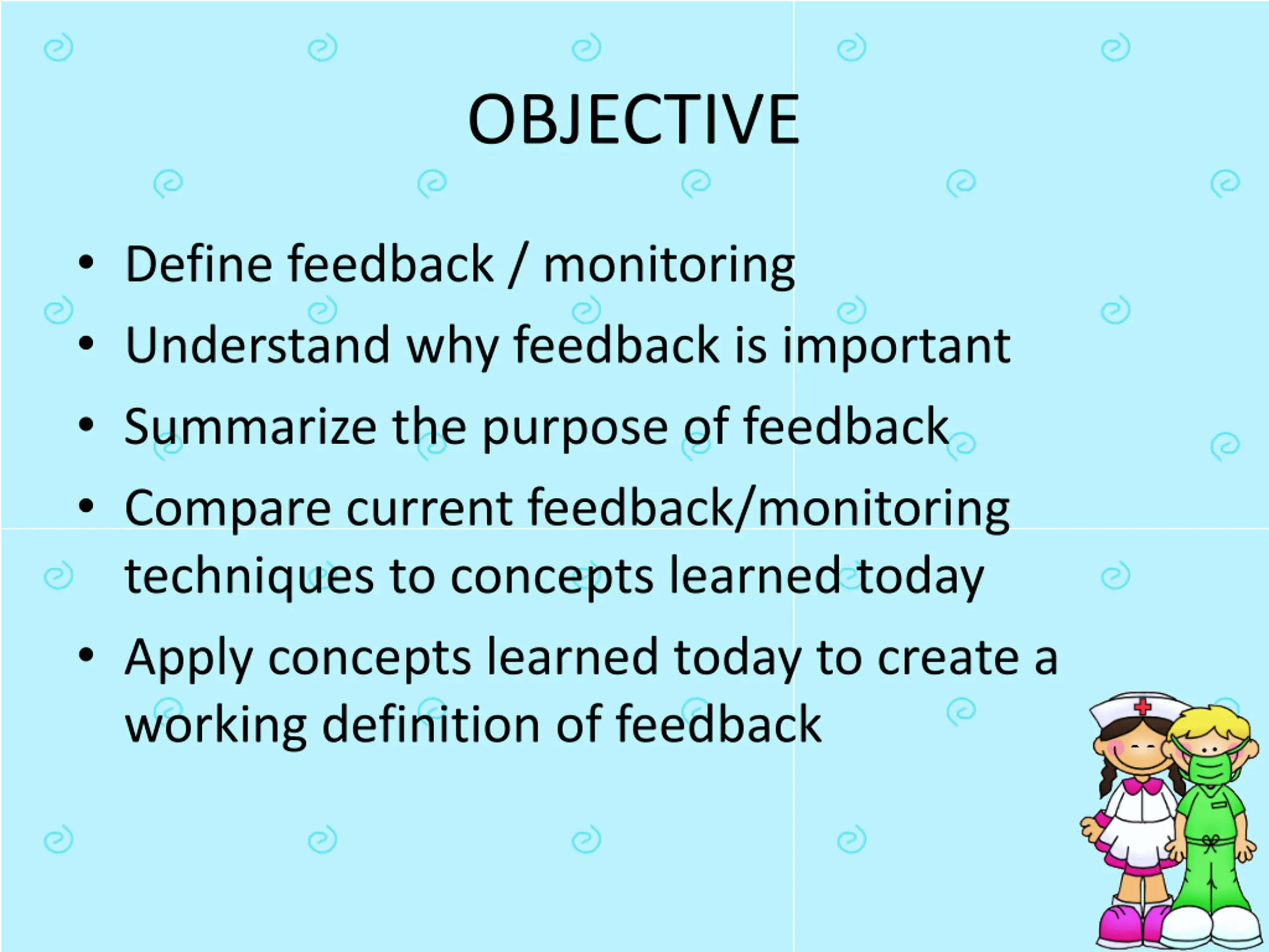 OBJECTIVE Define feedback / monitoring Understand why feedback is important Summarize the purpose of feedback Compare current feedback/monitoring techniques to concepts learned today Apply concepts learned today to create a working definition of feedback