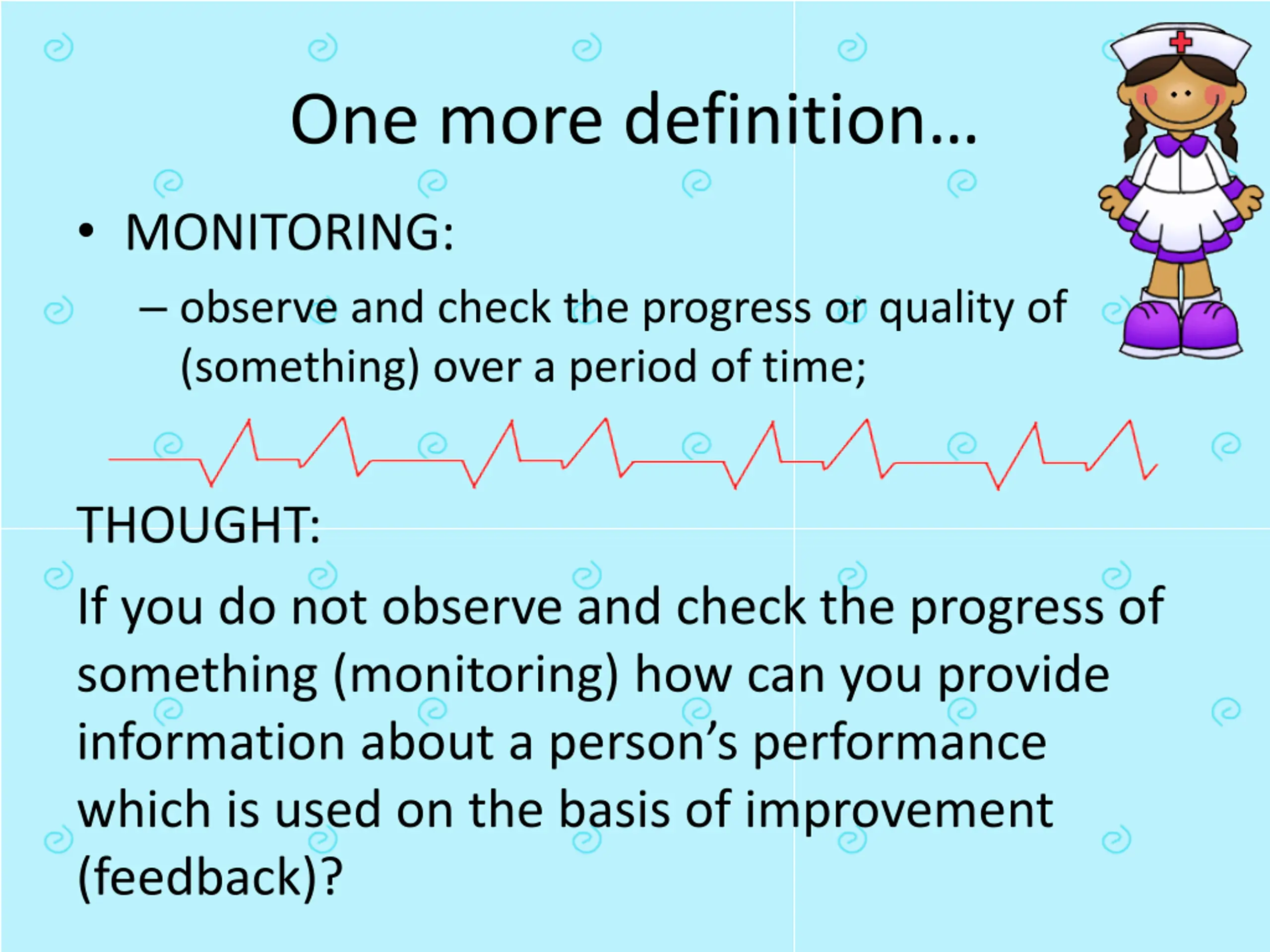 One more definition MONITORING: observe and check the progress or quality of (something) over a period of time; THOUGHT: If you do not observe and check the progress of something (monitoring) how can you provide information about a person s performance which is used on the basis of improvement (feedback)?