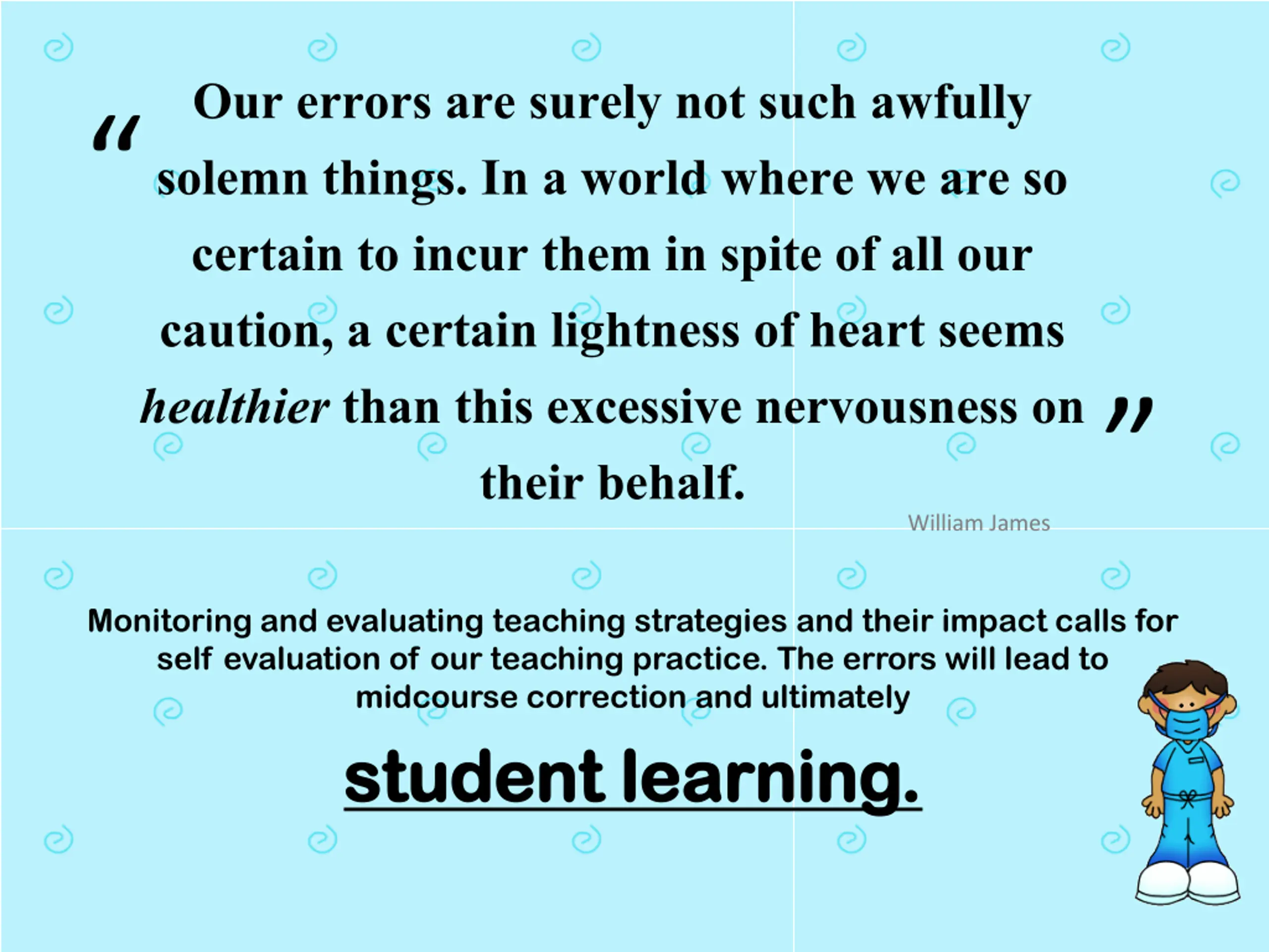Our errors are surely not such awfully solemn things. In a world where we are so certain to incur them in spite of all our caution, a certain lightness of heart seems healthier than this excessive nervousness on their behalf. William James Monitoring and evaluating teaching strategies and their impact calls for self evaluation of our teaching practice. The errors will lead to midcourse correction and ultimately student learning. student learning.