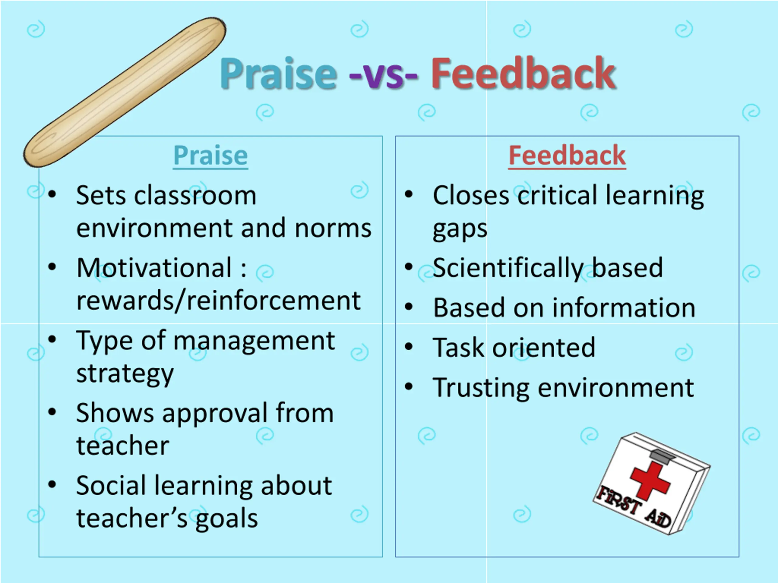 Praise -vs- Feedback Praise Feedback Sets classroom environment and norms Motivational : rewards/reinforcement Type of management strategy Shows approval from teacher Social learning about teacher s goals Closes critical learning gaps Scientifically based Based on information Task oriented Trusting environment