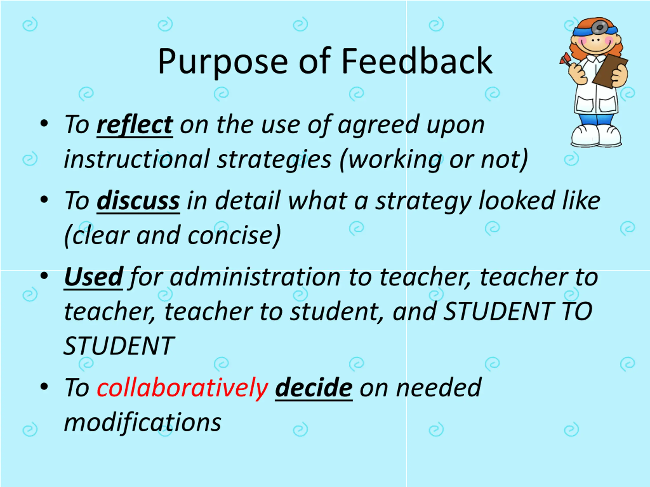 Purpose of Feedback To reflect on the use of agreed upon instructional strategies (working or not) To discuss in detail what a strategy looked like (clear and concise) Used for administration to teacher, teacher to teacher, teacher to student, and STUDENT TO STUDENT To collaboratively decide on needed modifications