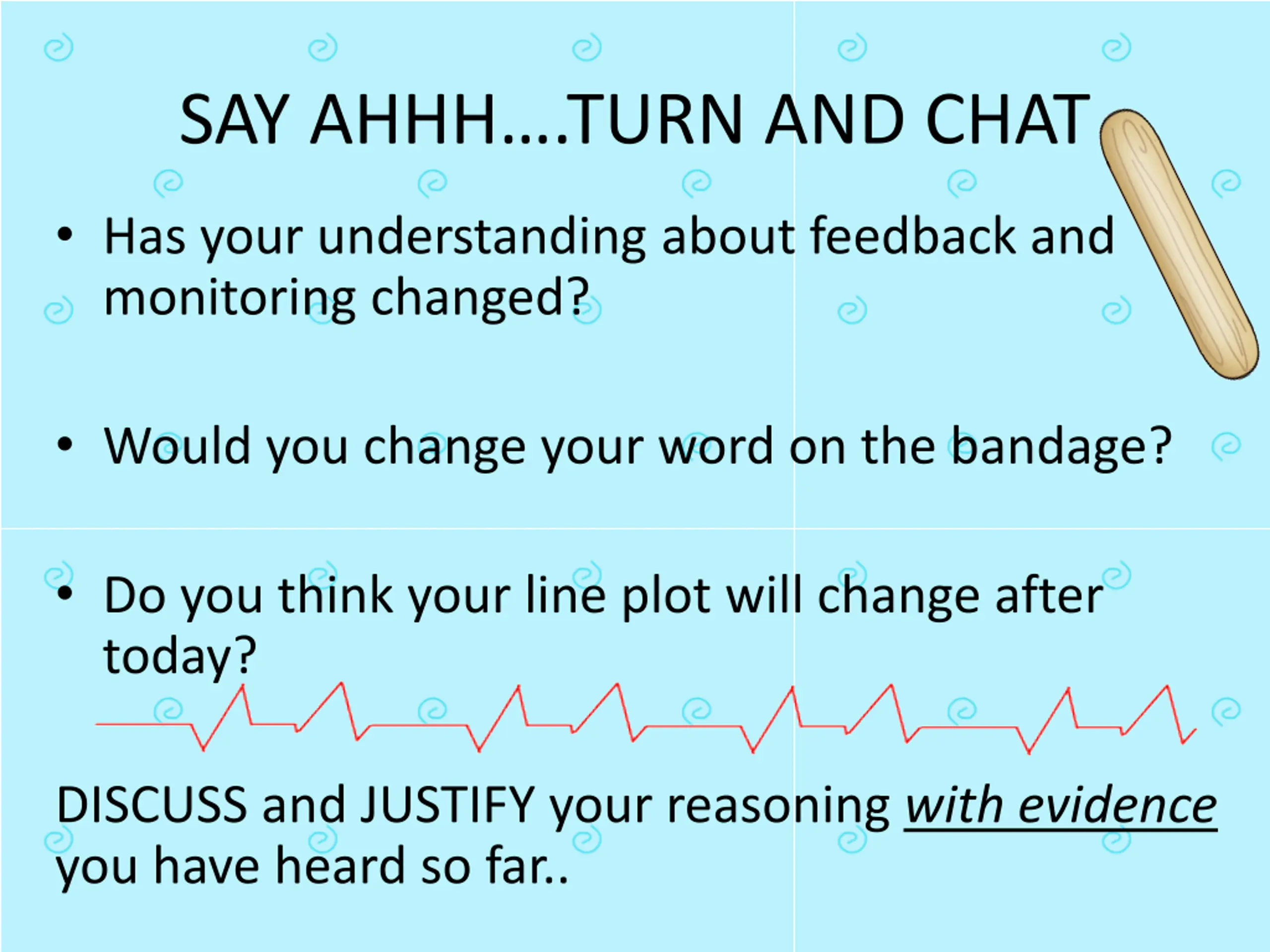 SAY AHHH.TURN AND CHAT Has your understanding about feedback and monitoring changed? Would you change your word on the bandage? Do you think your line plot will change after today? DISCUSS and JUSTIFY your reasoning with evidence you have heard so far..
