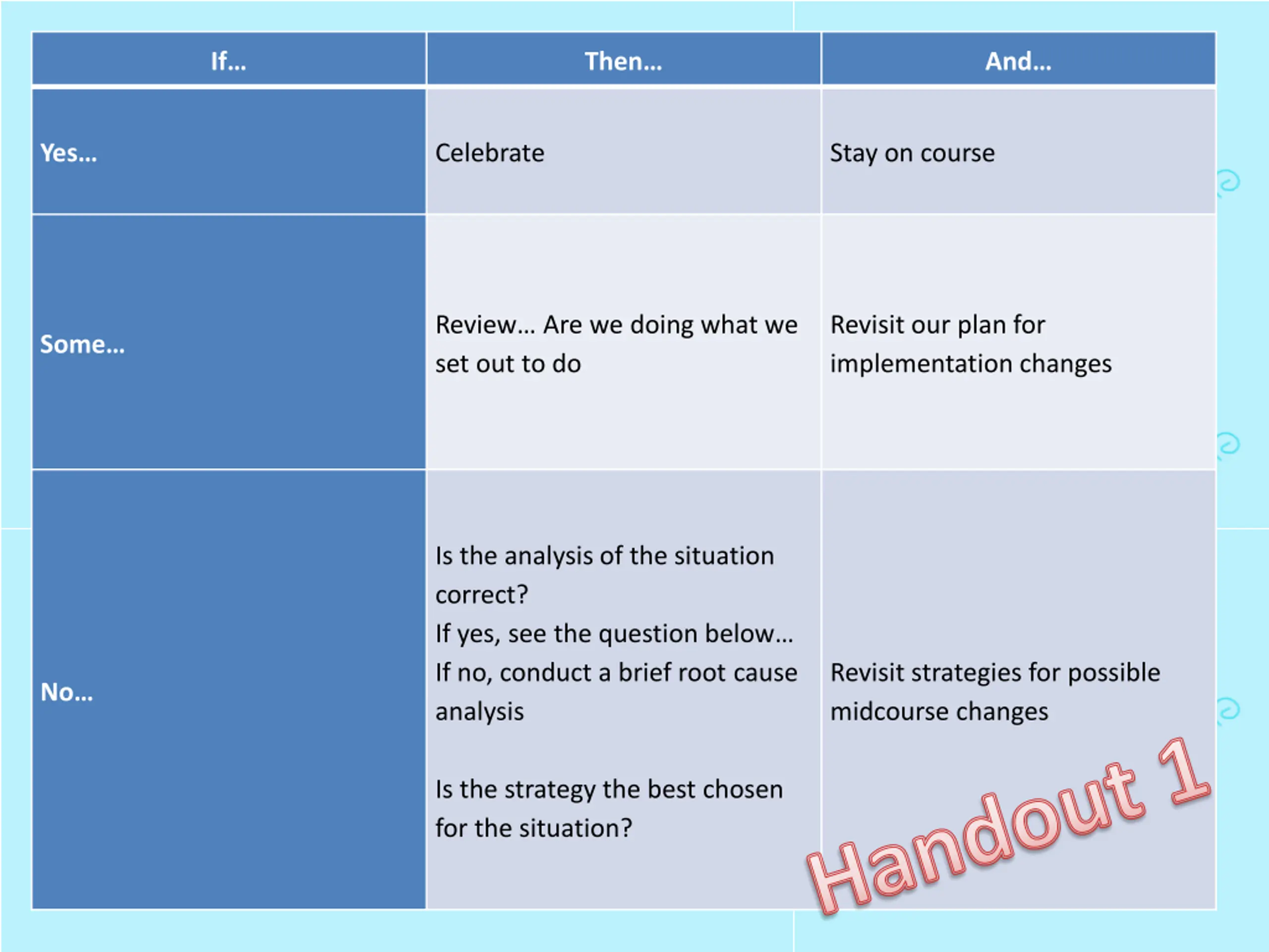If Then And Yes Celebrate Stay on course Review Are we doing what we set out to do Revisit our plan for implementation changes Some Is the analysis of the situation correct? If yes, see the question below If no, conduct a brief root cause analysis Revisit strategies for possible midcourse changes Handout 1 No Is the strategy the best chosen for the situation?