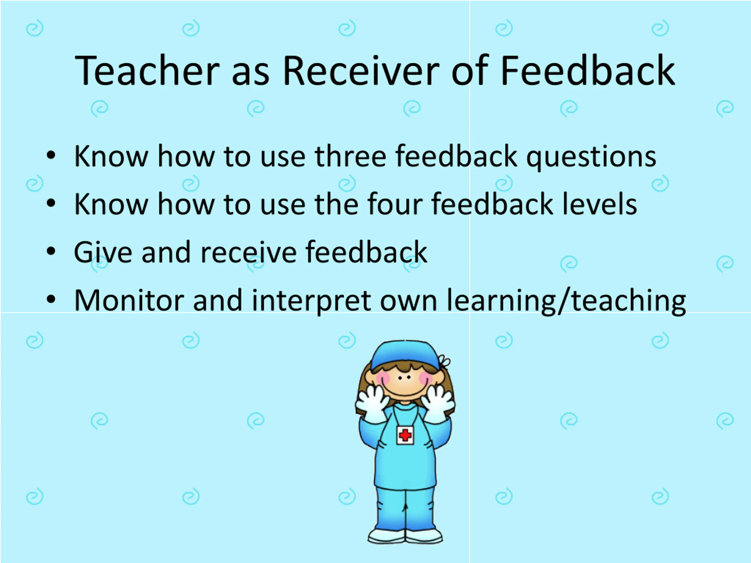 Teacher as Receiver of Feedback Know how to use three feedback questions Know how to use the four feedback levels Give and receive feedback Monitor and interpret own learning/teaching