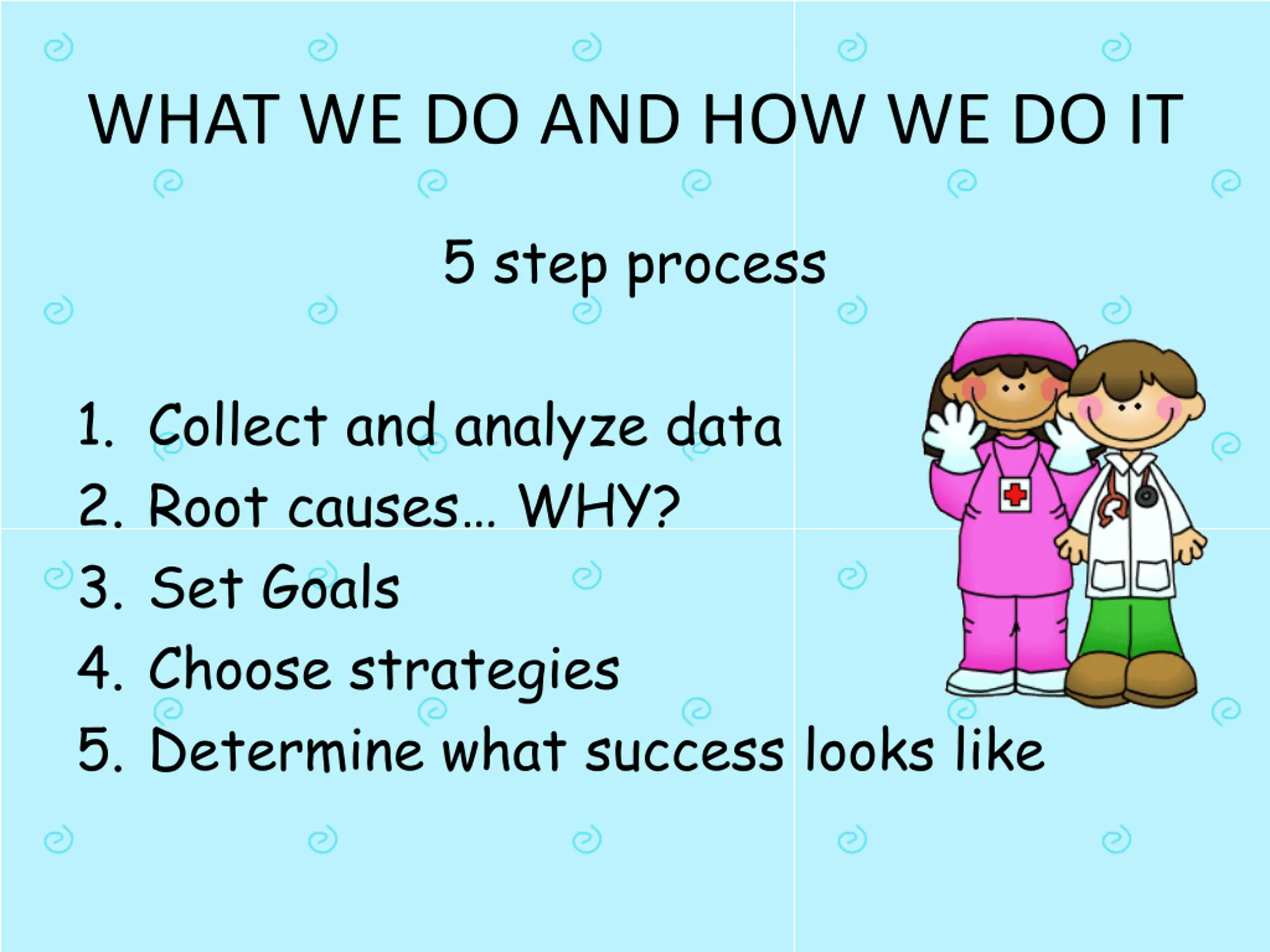 WHAT WE DO AND HOW WE DO IT 5 step process 1. Collect and analyze data 2. Root causes WHY? 3. Set Goals 4. Choose strategies 5. Determine what success looks like