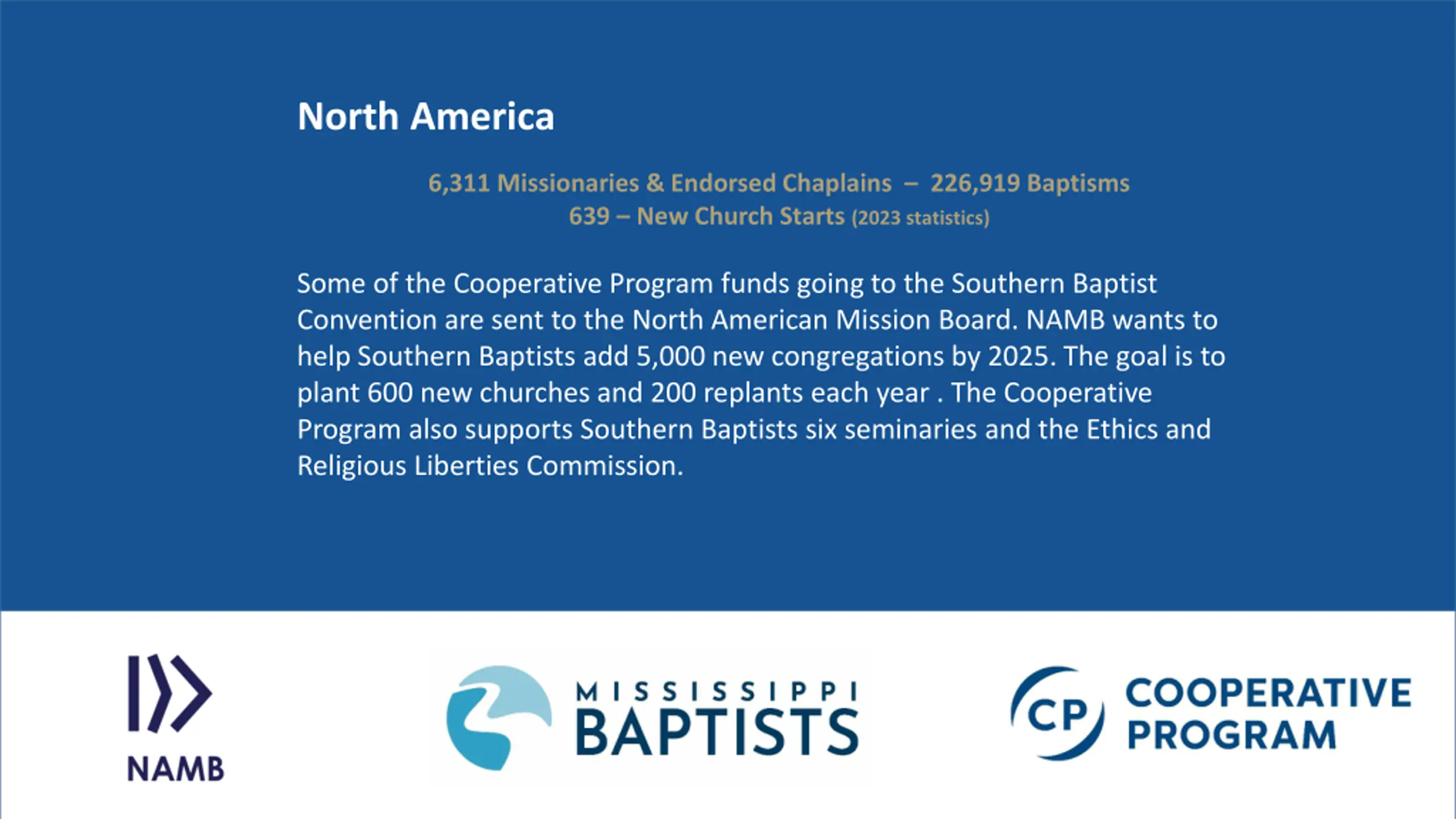 North America 6,311 Missionaries & Endorsed Chaplains 226,919 Baptisms 639 New Church Starts (2023 statistics) Some of the Cooperative Program funds going to the Southern Baptist Convention are sent to the North American Mission Board. NAMB wants to help Southern Baptists add 5,000 new congregations by 2025. The goal is to plant 600 new churches and 200 replants each year . The Cooperative Program also supports Southern Baptists six seminaries and the Ethics and Religious Liberties Commission.