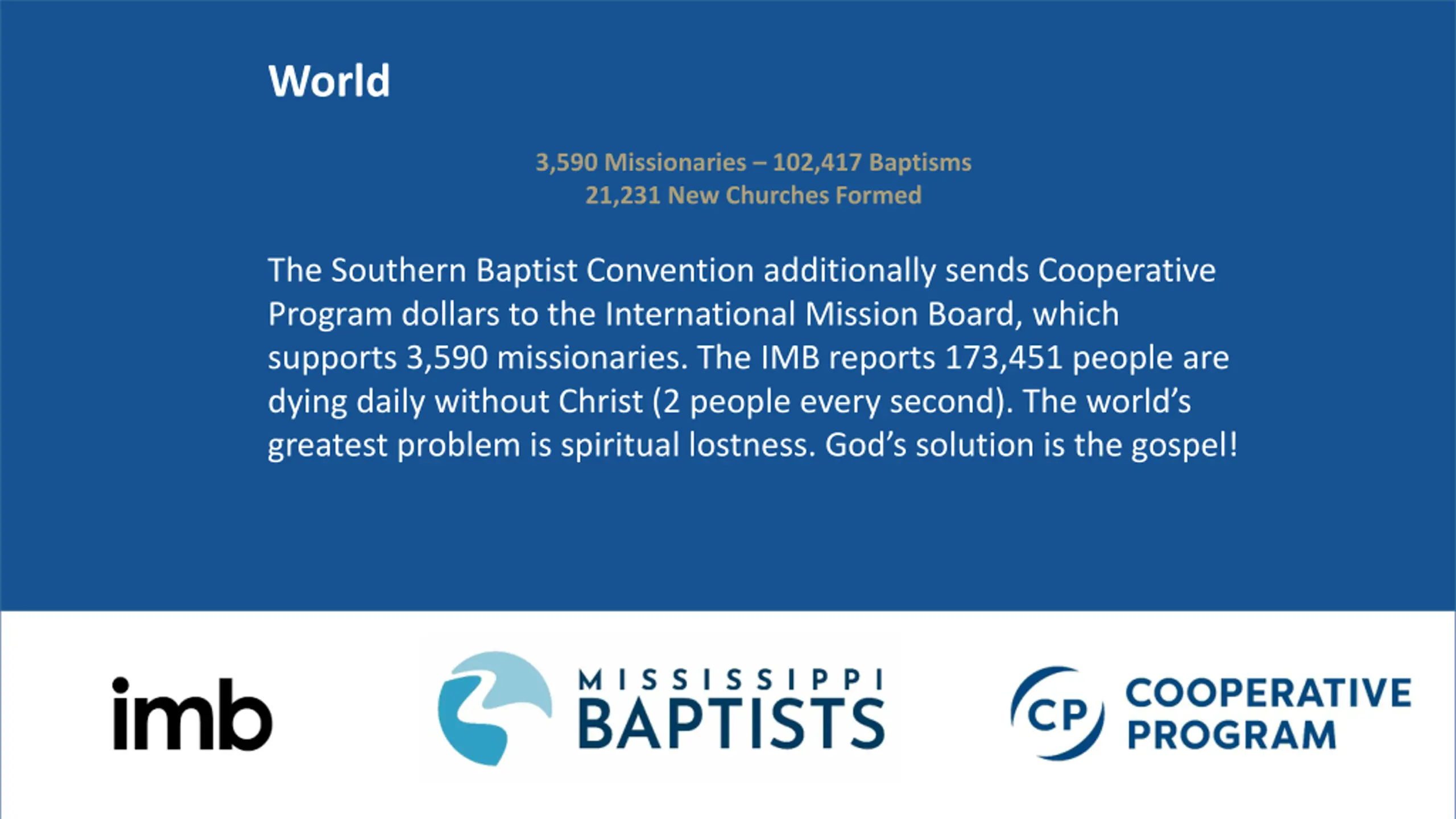 World 3,590 Missionaries 102,417 Baptisms 21,231 New Churches Formed The Southern Baptist Convention additionally sends Cooperative Program dollars to the International Mission Board, which supports 3,590 missionaries. The IMB reports 173,451 people are dying daily without Christ (2 people every second). The world s greatest problem is spiritual lostness. God s solution is the gospel!