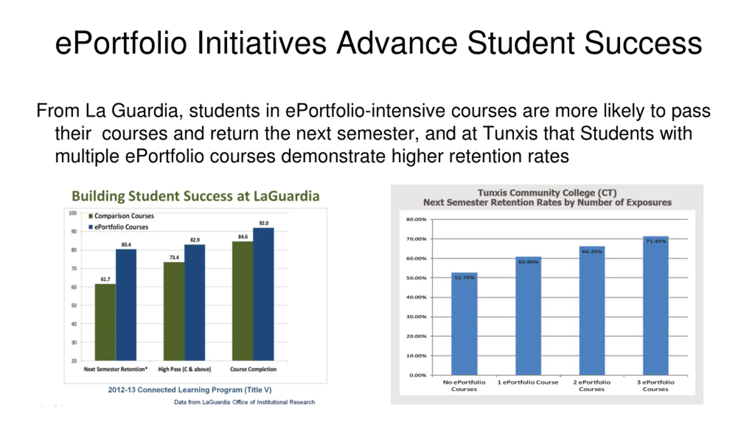 ePortfolio Initiatives Advance Student Success From La Guardia, students in ePortfolio-intensive courses are more likely to pass their courses and return the next semester, and at Tunxis that Students with multiple ePortfolio courses demonstrate higher retention rates