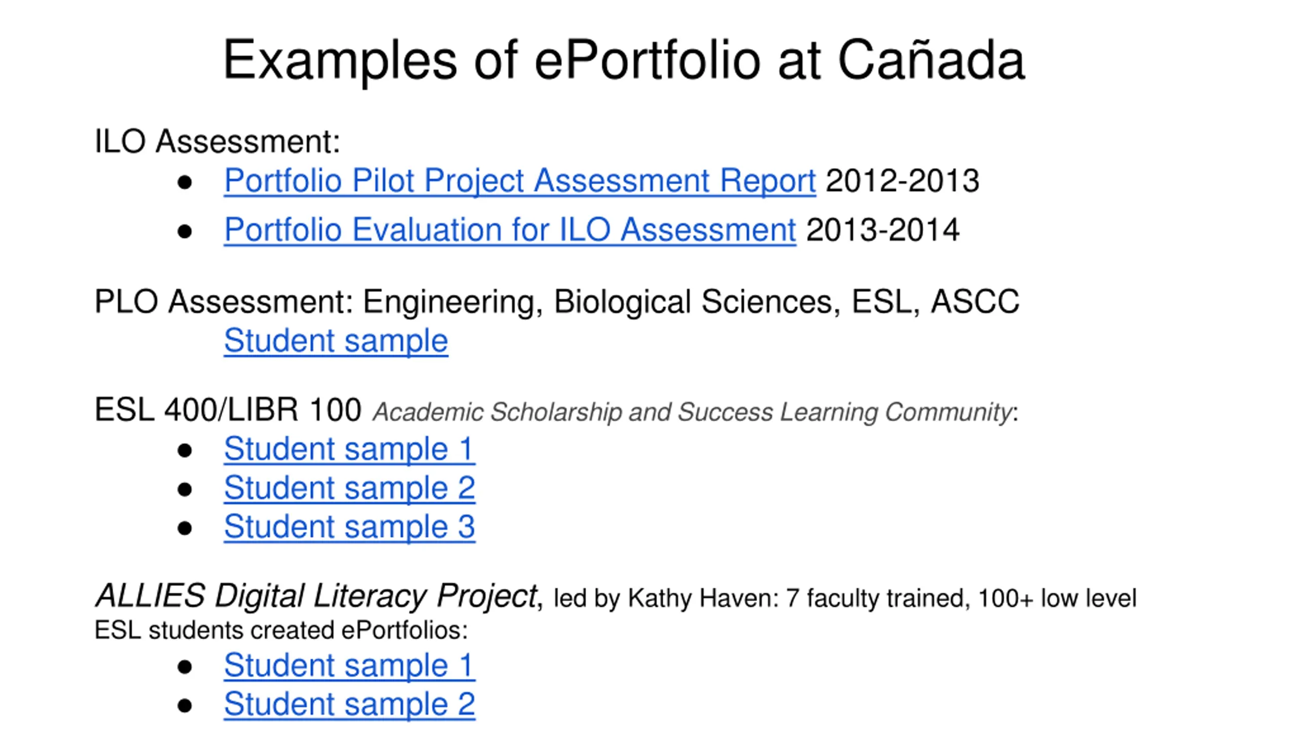 Examples of ePortfolio at Caada ILO Assessment: Portfolio Pilot Project Assessment Report 2012-2013 Portfolio Evaluation for ILO Assessment 2013-2014 PLO Assessment: Engineering, Biological Sciences, ESL, ASCC Student sample ESL 400/LIBR 100 Academic Scholarship and Success Learning Community: Student sample 1 Student sample 2 Student sample 3 ALLIES Digital Literacy Project, led by Kathy Haven: 7 faculty trained, 100+ low level ESL students created ePortfolios: Student sample 1 Student sample 2