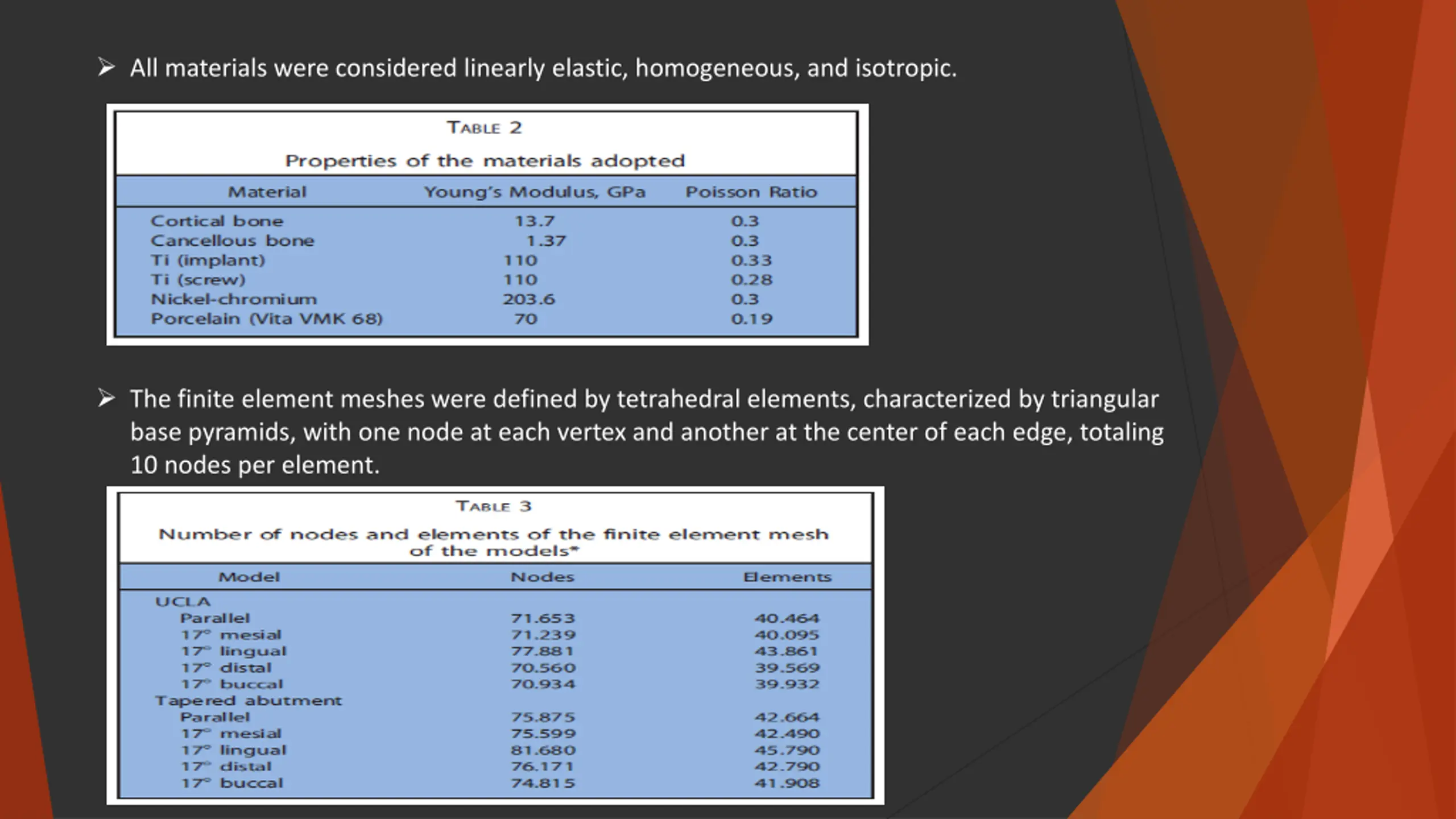All materials were considered linearly elastic, homogeneous, and isotropic. The finite element meshes were defined by tetrahedral elements, characterized by triangular base pyramids, with one node at each vertex and another at the center of each edge, totaling 10 nodes per element.