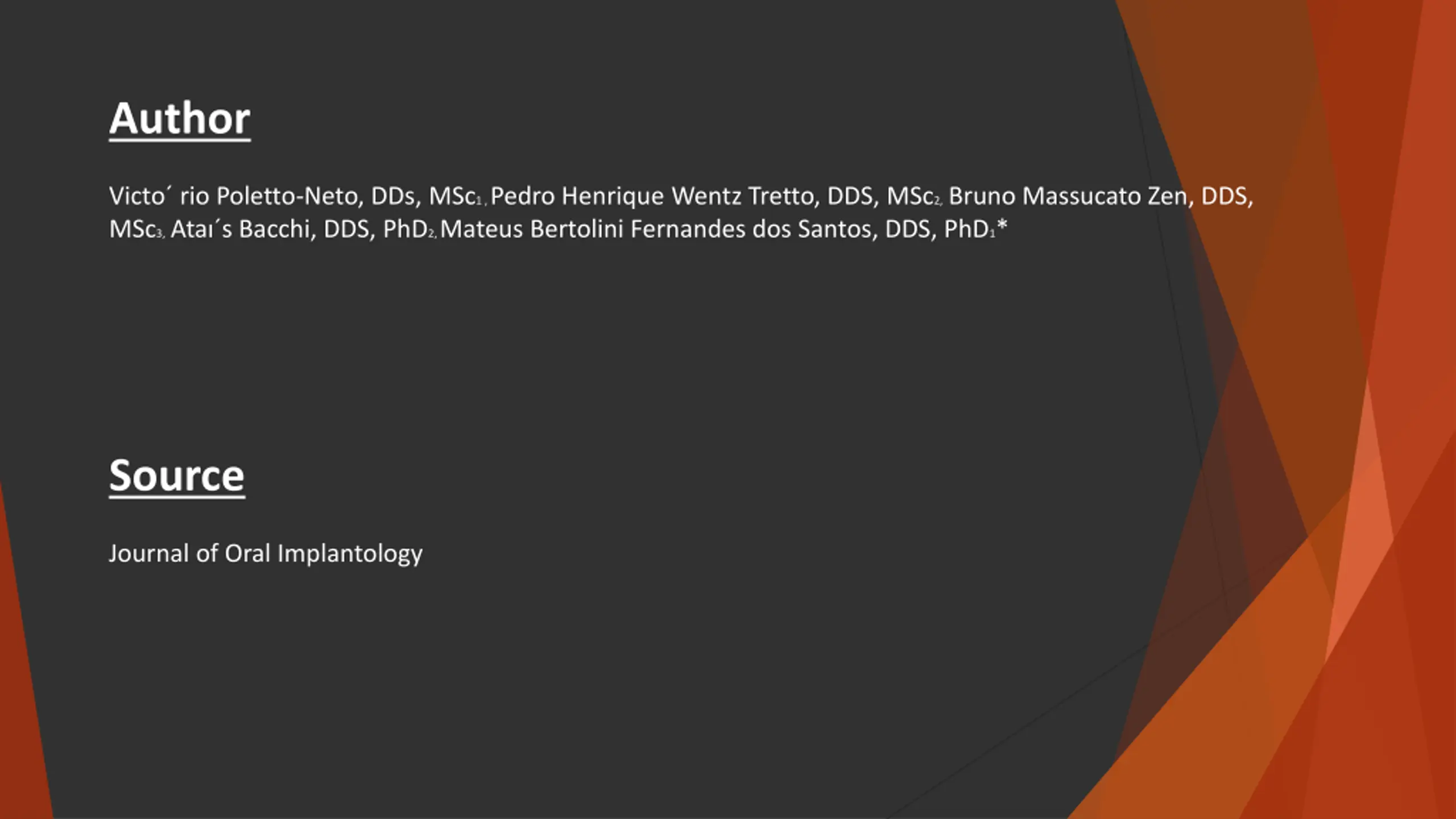 Author Victo rio Poletto-Neto, DDs, MSc1 , Pedro Henrique Wentz Tretto, DDS, MSc2, Bruno Massucato Zen, DDS, MSc3, Ata s Bacchi, DDS, PhD2, Mateus Bertolini Fernandes dos Santos, DDS, PhD1* Source Journal of Oral Implantology