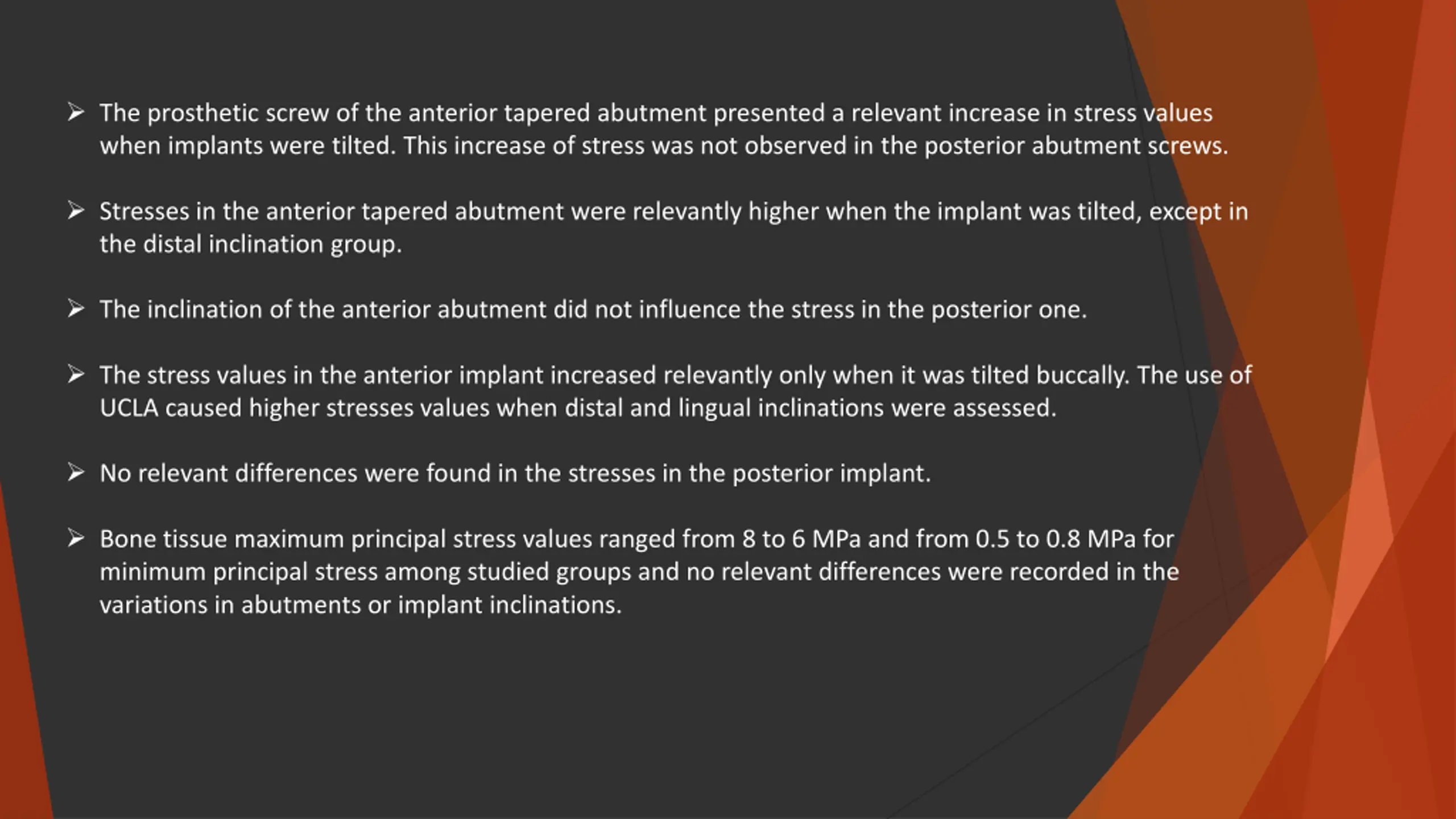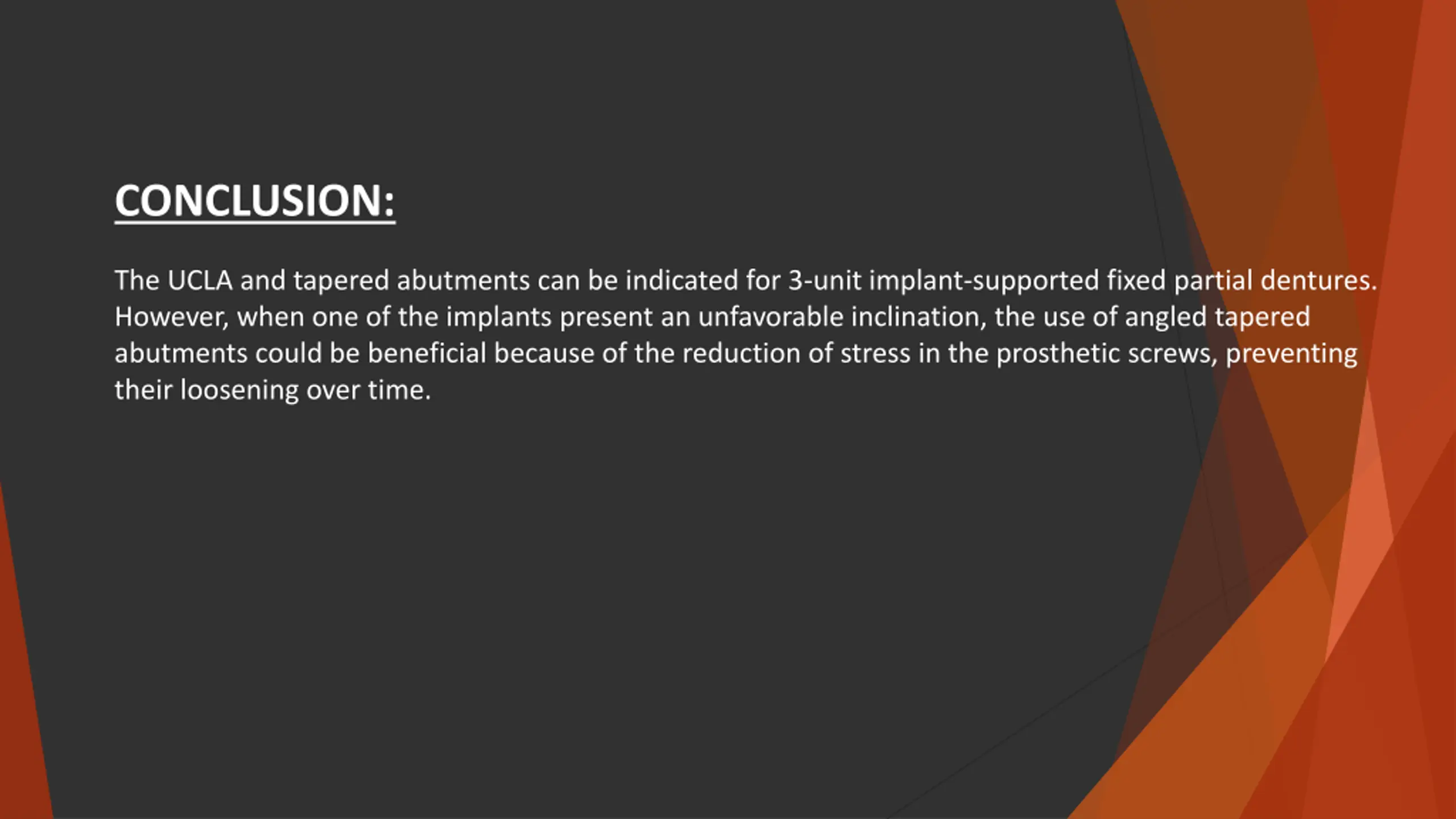 CONCLUSION: The UCLA and tapered abutments can be indicated for 3-unit implant-supported fixed partial dentures. However, when one of the implants present an unfavorable inclination, the use of angled tapered abutments could be beneficial because of the reduction of stress in the prosthetic screws, preventing their loosening over time.
