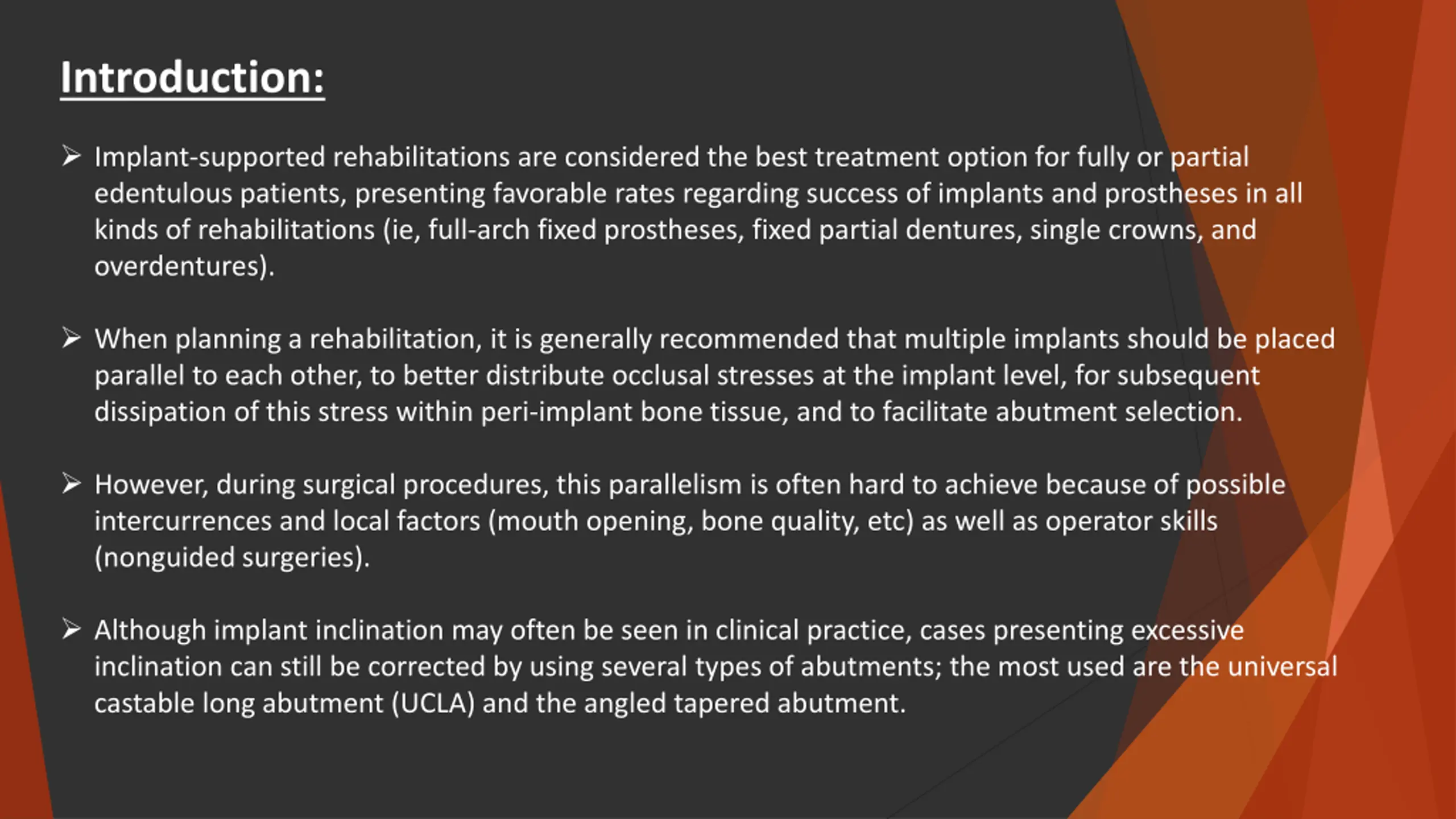 Introduction: Implant-supported rehabilitations are considered the best treatment option for fully or partial edentulous patients, presenting favorable rates regarding success of implants and prostheses in all kinds of rehabilitations (ie, full-arch fixed prostheses, fixed partial dentures, single crowns, and overdentures). When planning a rehabilitation, it is generally recommended that multiple implants should be placed parallel to each other, to better distribute occlusal stresses at the implant level, for subsequent dissipation of this stress within peri-implant bone tissue, and to facilitate abutment selection. However, during surgical procedures, this parallelism is often hard to achieve because of possible intercurrences and local factors (mouth opening, bone quality, etc) as well as operator skills (nonguided surgeries). Although implant inclination may often be seen in clinical practice, cases presenting excessive inclination can still be corrected by using several types of abutments; the most used are the universal castable long abutment (UCLA) and the angled tapered abutment.