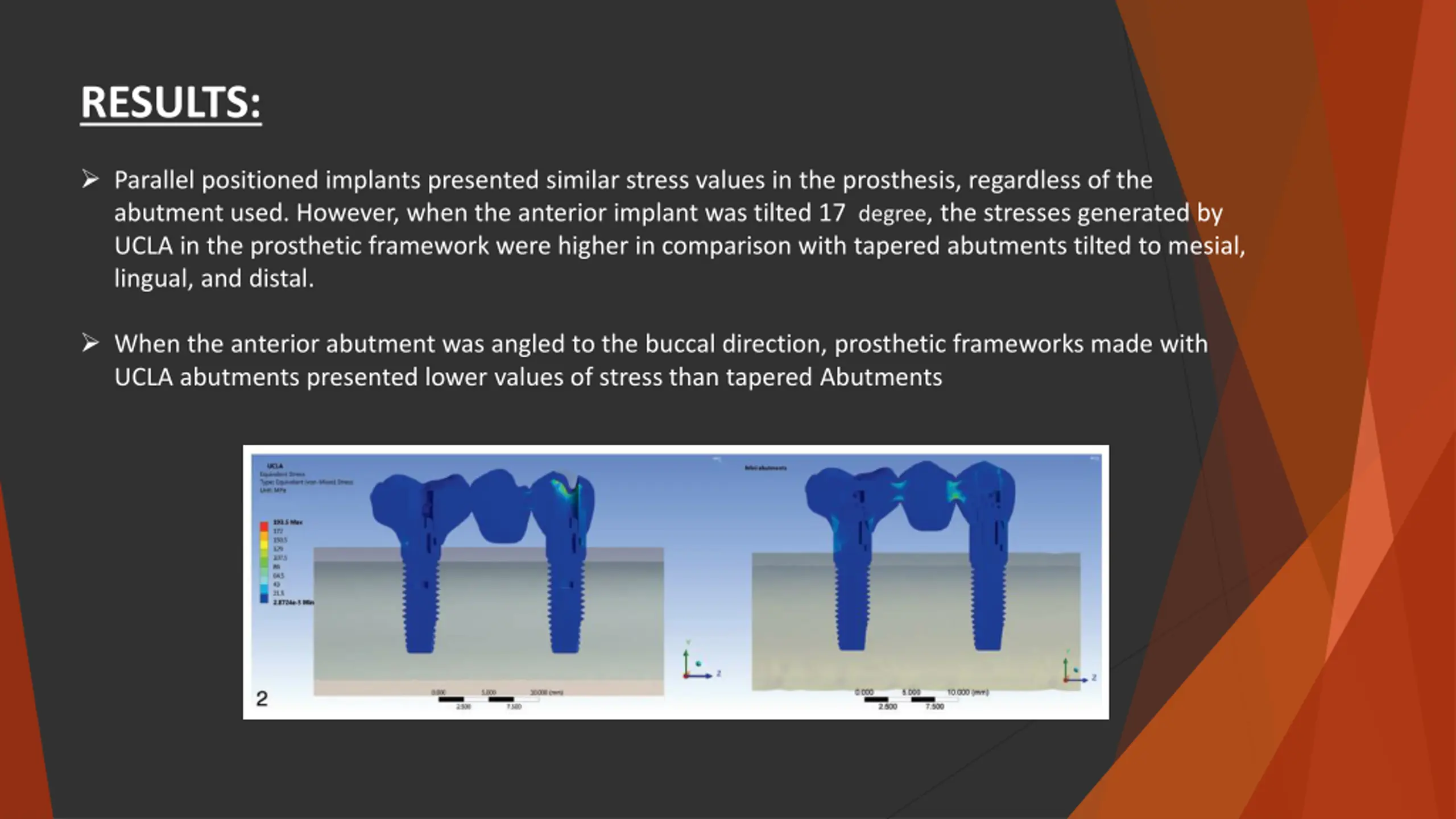RESULTS: Parallel positioned implants presented similar stress values in the prosthesis, regardless of the abutment used. However, when the anterior implant was tilted 17 degree, the stresses generated by UCLA in the prosthetic framework were higher in comparison with tapered abutments tilted to mesial, lingual, and distal. When the anterior abutment was angled to the buccal direction, prosthetic frameworks made with UCLA abutments presented lower values of stress than tapered Abutments