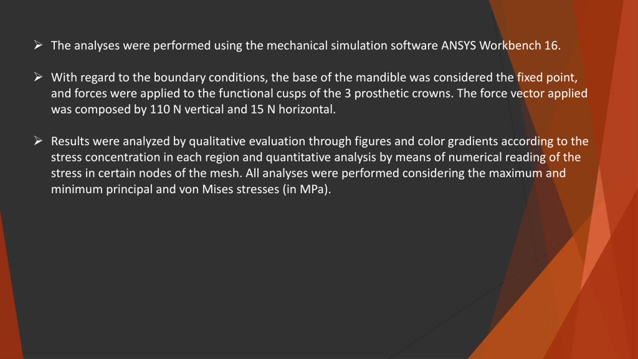 The analyses were performed using the mechanical simulation software ANSYS Workbench 16. With regard to the boundary conditions, the base of the mandible was considered the fixed point, and forces were applied to the functional cusps of the 3 prosthetic crowns. The force vector applied was composed by 110 N vertical and 15 N horizontal. Results were analyzed by qualitative evaluation through figures and color gradients according to the stress concentration in each region and quantitative analysis by means of numerical reading of the stress in certain nodes of the mesh. All analyses were performed considering the maximum and minimum principal and von Mises stresses (in MPa).