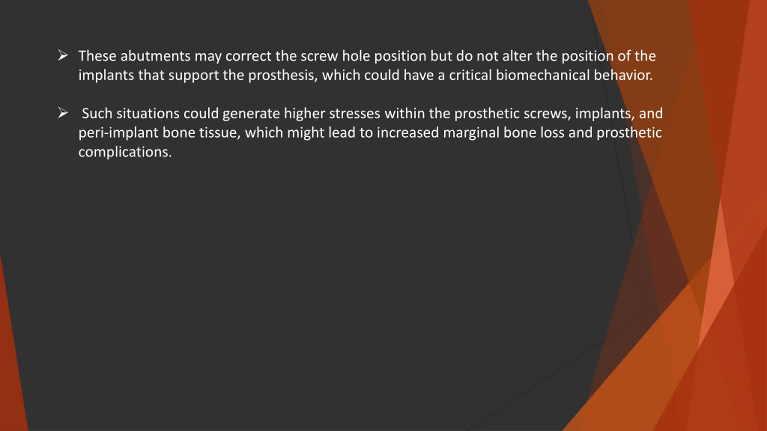 These abutments may correct the screw hole position but do not alter the position of the implants that support the prosthesis, which could have a critical biomechanical behavior. Such situations could generate higher stresses within the prosthetic screws, implants, and peri-implant bone tissue, which might lead to increased marginal bone loss and prosthetic complications.