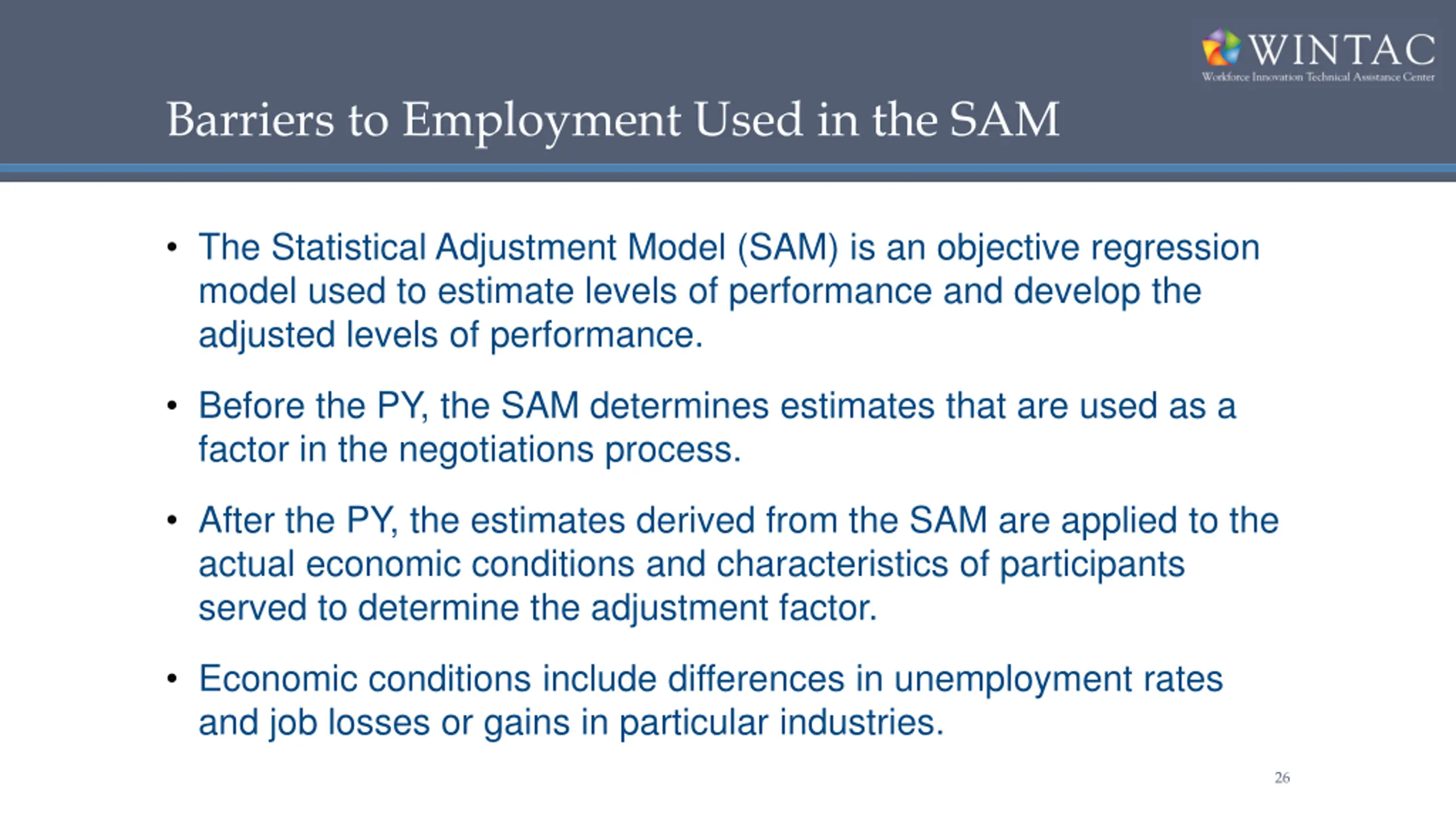 Barriers to Employment Used in the SAM The Statistical Adjustment Model (SAM) is an objective regression model used to estimate levels of performance and develop the adjusted levels of performance. Before the PY, the SAM determines estimates that are used as a factor in the negotiations process. After the PY, the estimates derived from the SAM are applied to the actual economic conditions and characteristics of participants served to determine the adjustment factor. Economic conditions include differences in unemployment rates and job losses or gains in particular industries. 26