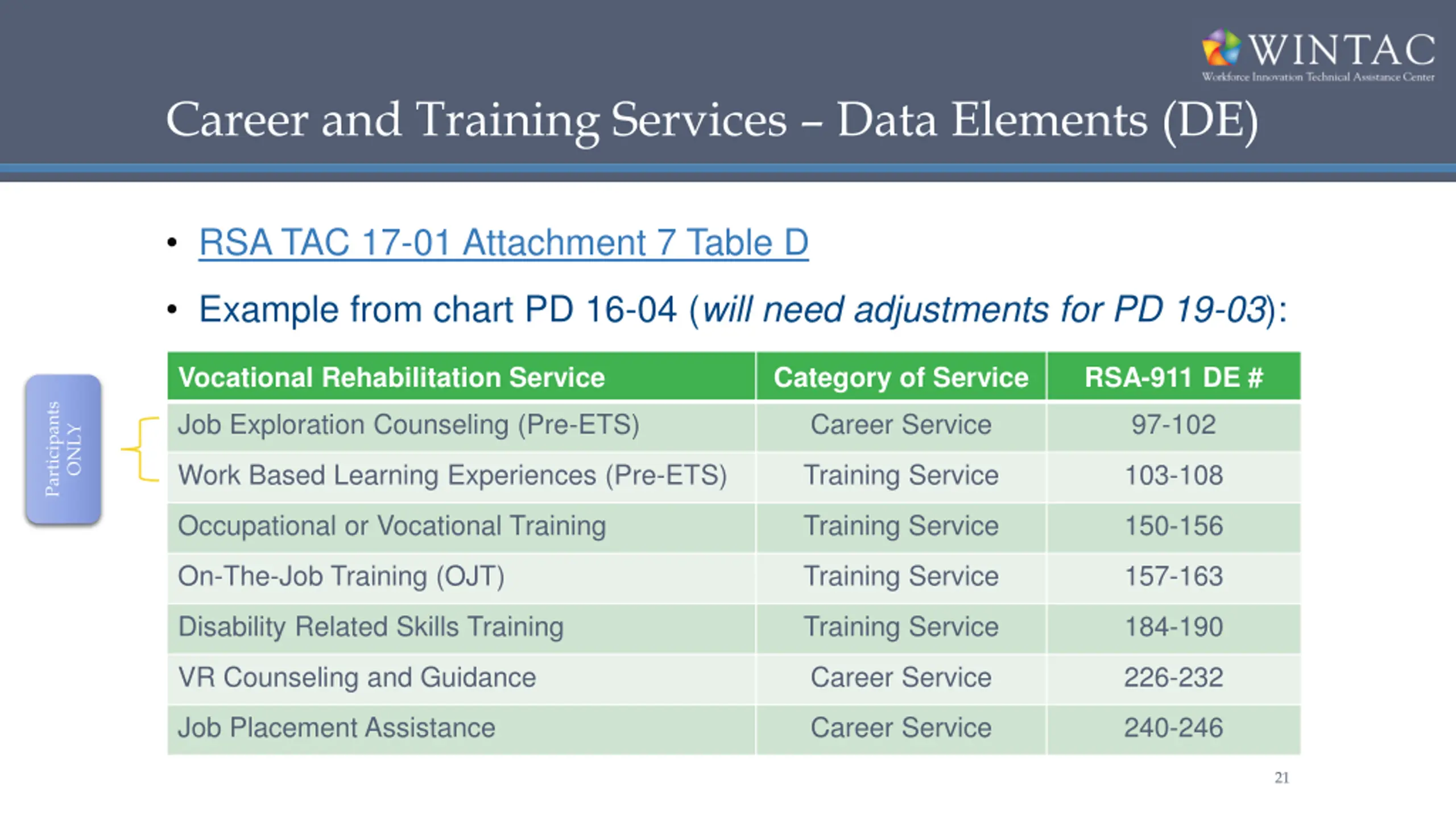 Career and Training Services Data Elements (DE) RSA TAC 17-01 Attachment 7 Table D Example from chart PD 16-04 (will need adjustments for PD 19-03): Vocational Rehabilitation Service Category of Service RSA-911 DE # Participants Job Exploration Counseling (Pre-ETS) Career Service 97-102 ONLY Work Based Learning Experiences (Pre-ETS) Training Service 103-108 Occupational or Vocational Training Training Service 150-156 On-The-Job Training (OJT) Training Service 157-163 Disability Related Skills Training Training Service 184-190 VR Counseling and Guidance Career Service 226-232 Job Placement Assistance Career Service 240-246 21