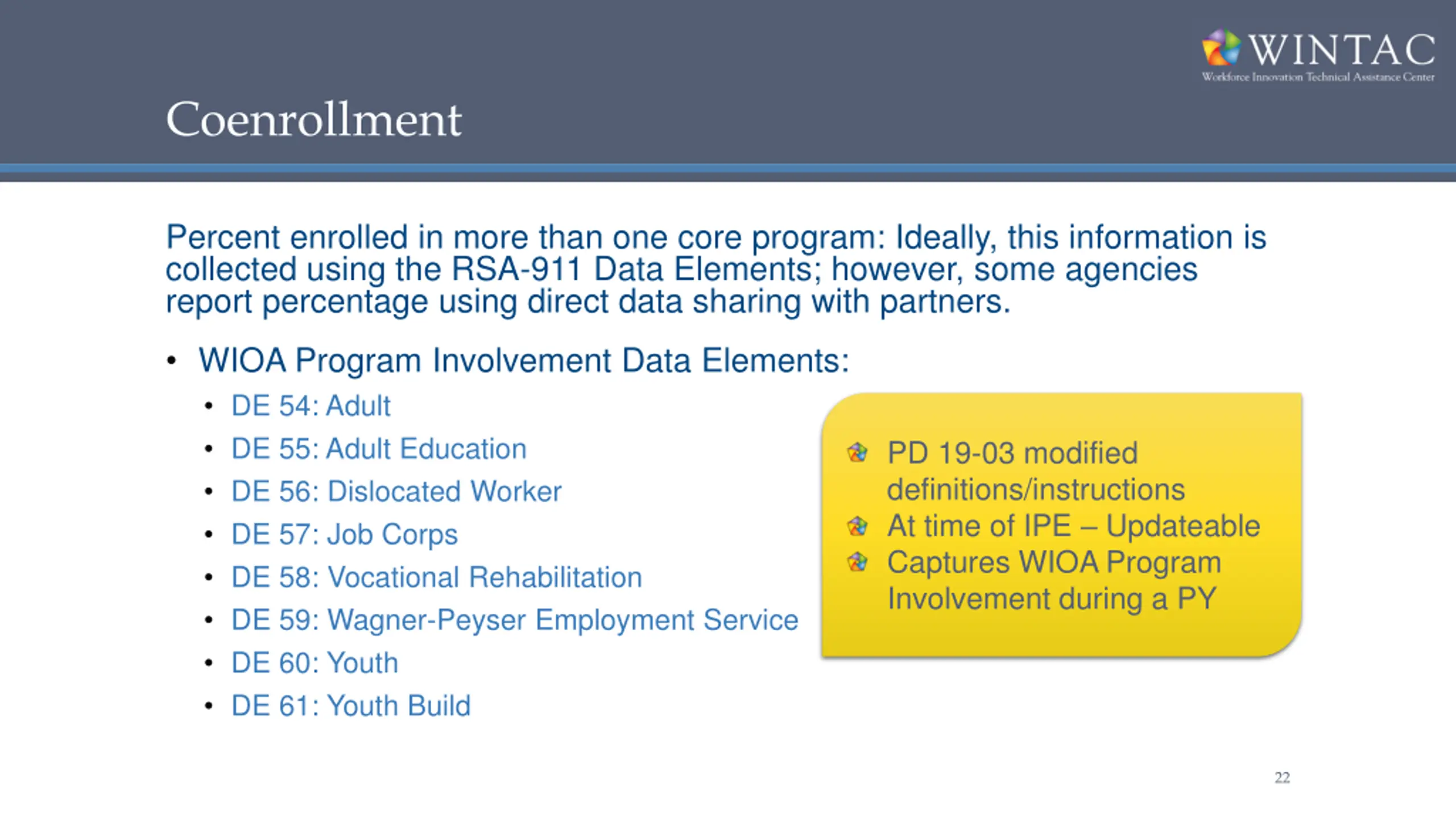 Coenrollment Percent enrolled in more than one core program: Ideally, this information is collected using the RSA-911 Data Elements; however, some agencies report percentage using direct data sharing with partners. WIOA Program Involvement Data Elements: DE 54: Adult DE 55: Adult Education DE 56: Dislocated Worker DE 57: Job Corps DE 58: Vocational Rehabilitation DE 59: Wagner-Peyser Employment Service DE 60: Youth DE 61: Youth Build PD 19-03 modified definitions/instructions At time of IPE Updateable Captures WIOA Program Involvement during a PY 22