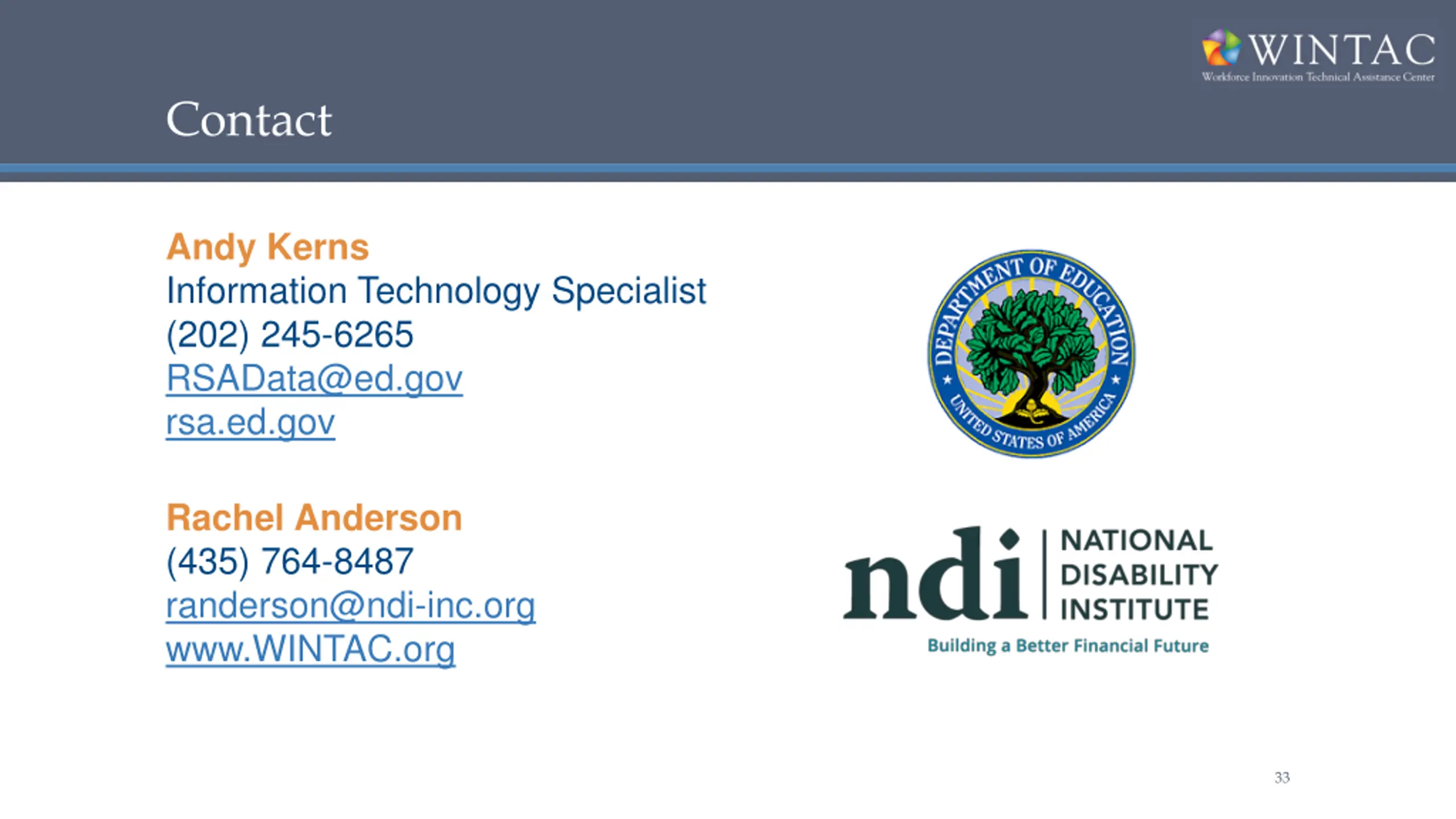 Contact Andy Kerns Information Technology Specialist (202) 245-6265 RSAData@ed.gov rsa.ed.gov Rachel Anderson (435) 764-8487 randerson@ndi-inc.org www.WINTAC.org 33