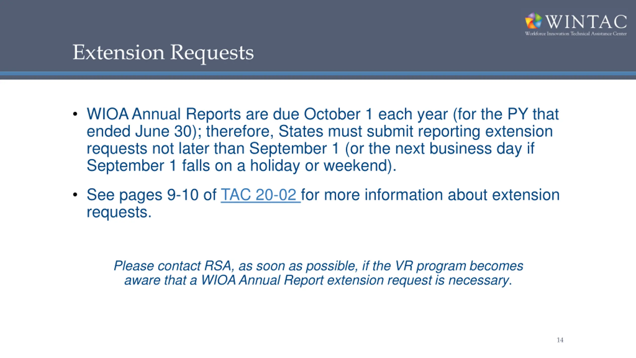 Extension Requests WIOA Annual Reports are due October 1 each year (for the PY that ended June 30); therefore, States must submit reporting extension requests not later than September 1 (or the next business day if September 1 falls on a holiday or weekend). See pages 9-10 of TAC 20-02 for more information about extension requests. Please contact RSA, as soon as possible, if the VR program becomes aware that a WIOA Annual Report extension request is necessary. 14