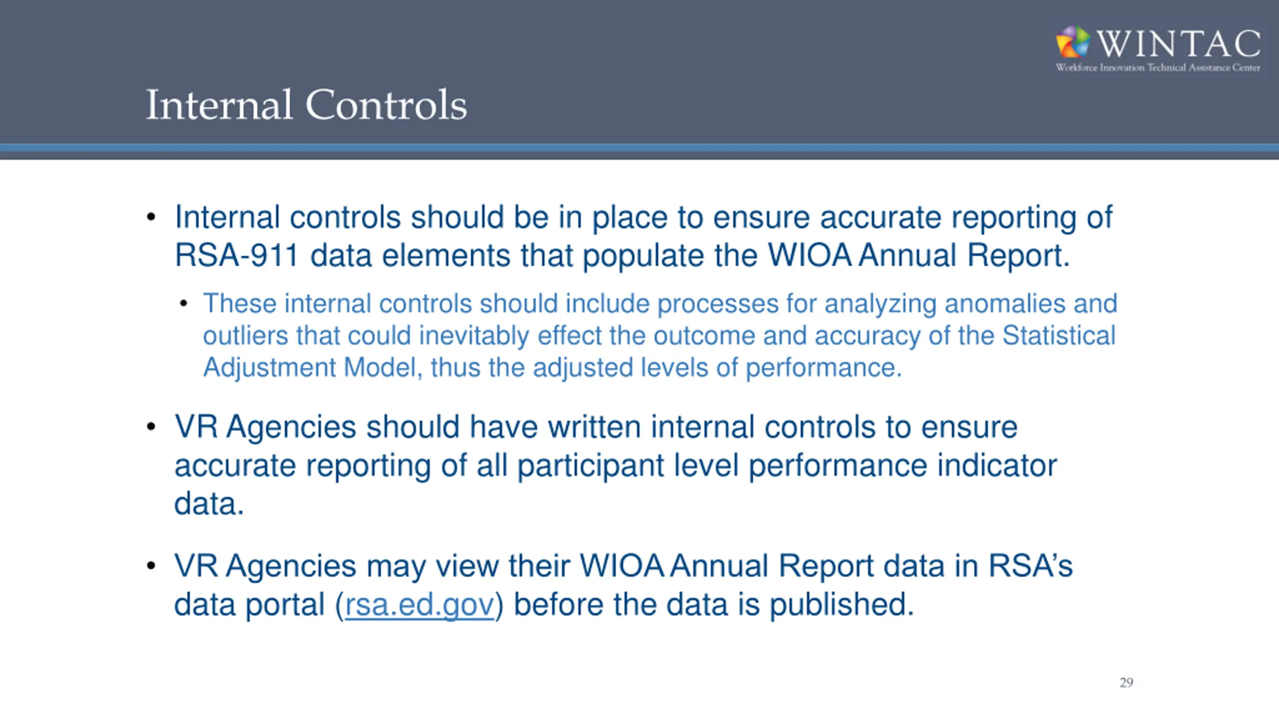 Internal Controls Internal controls should be in place to ensure accurate reporting of RSA-911 data elements that populate the WIOA Annual Report. These internal controls should include processes for analyzing anomalies and outliers that could inevitably effect the outcome and accuracy of the Statistical Adjustment Model, thus the adjusted levels of performance. VR Agencies should have written internal controls to ensure accurate reporting of all participant level performance indicator data. VR Agencies may view their WIOA Annual Report data in RSA s data portal (rsa.ed.gov) before the data is published. 29