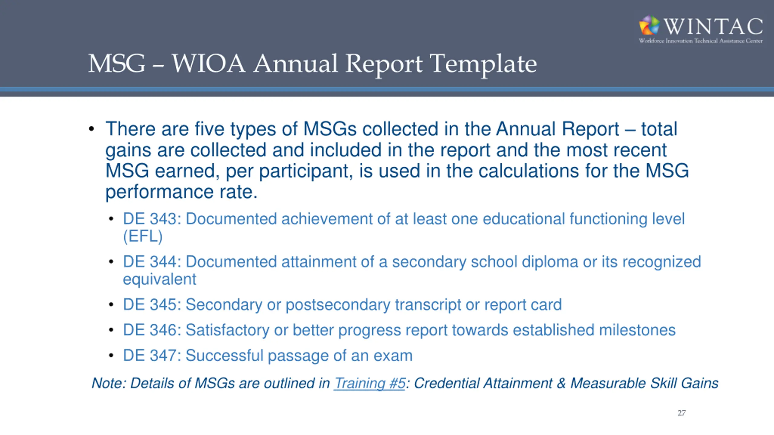 MSG WIOA Annual Report Template There are five types of MSGs collected in the Annual Report total gains are collected and included in the report and the most recent MSG earned, per participant, is used in the calculations for the MSG performance rate. DE 343: Documented achievement of at least one educational functioning level (EFL) DE 344: Documented attainment of a secondary school diploma or its recognized equivalent DE 345: Secondary or postsecondary transcript or report card DE 346: Satisfactory or better progress report towards established milestones DE 347: Successful passage of an exam Note: Details of MSGs are outlined in Training #5: Credential Attainment & Measurable Skill Gains 27
