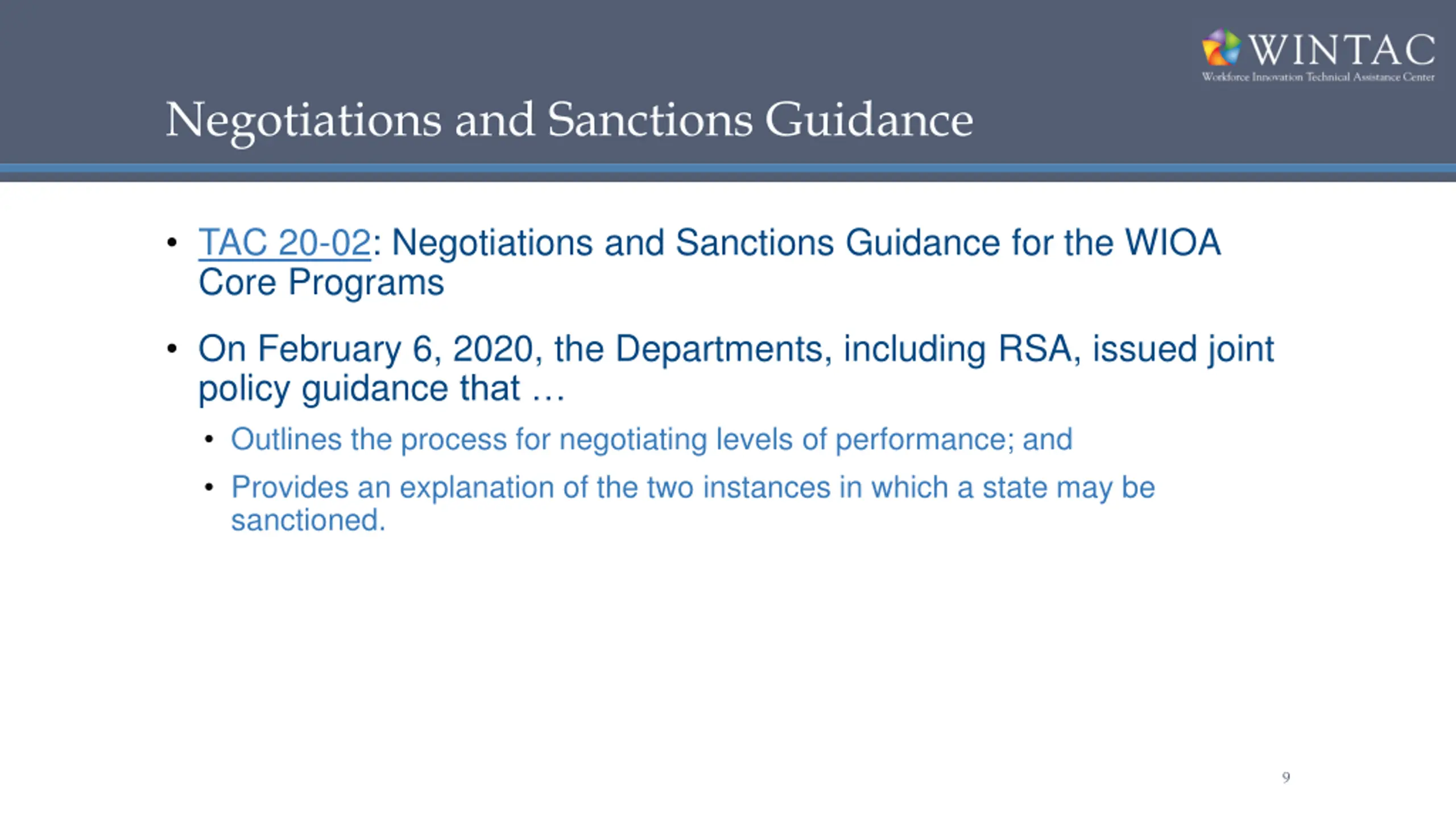 Negotiations and Sanctions Guidance TAC 20-02: Negotiations and Sanctions Guidance for the WIOA Core Programs On February 6, 2020, the Departments, including RSA, issued joint policy guidance that Outlines the process for negotiating levels of performance; and Provides an explanation of the two instances in which a state may be sanctioned. 9