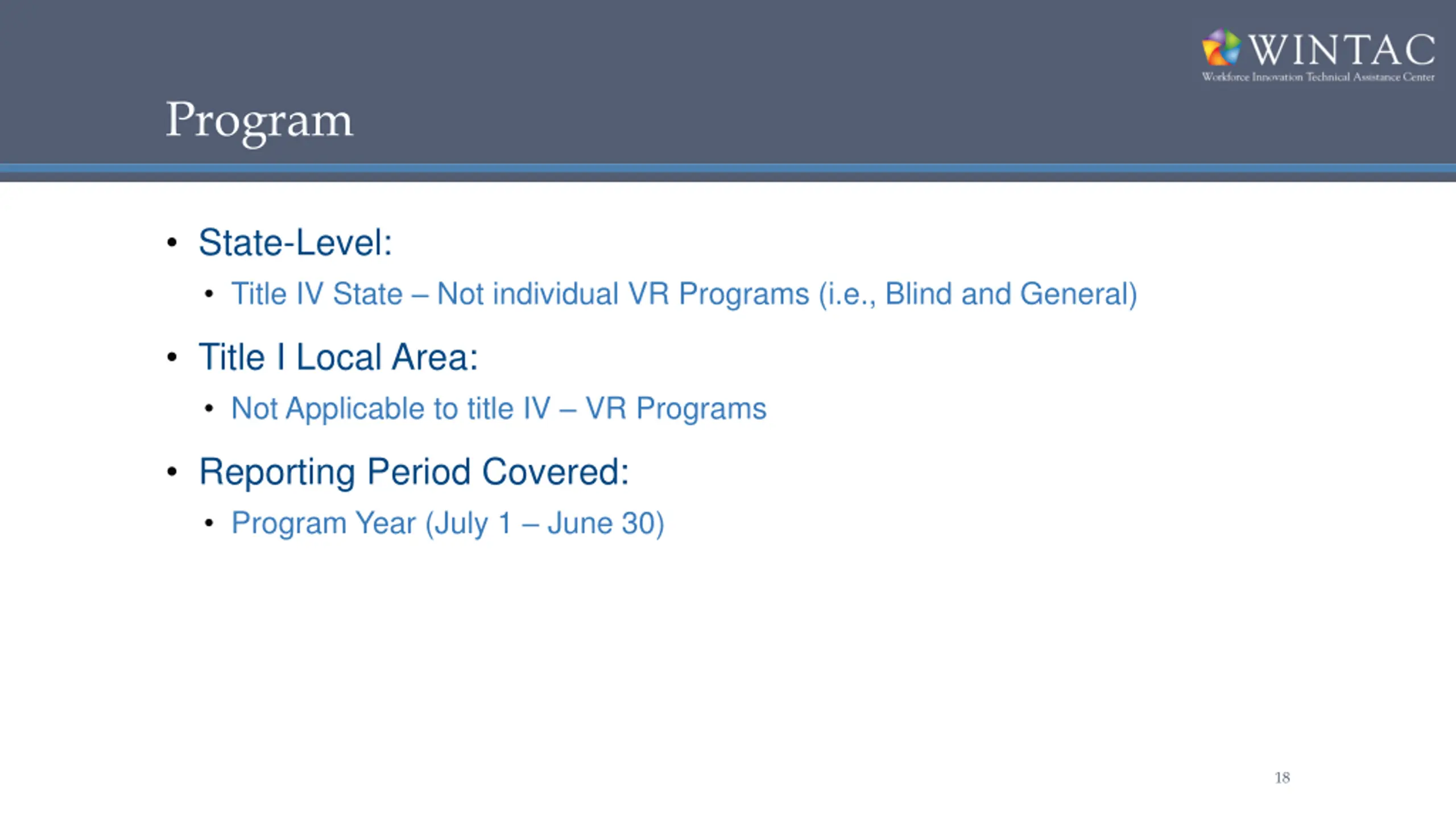 Program State-Level: Title IV State Not individual VR Programs (i.e., Blind and General) Title I Local Area: Not Applicable to title IV VR Programs Reporting Period Covered: Program Year (July 1 June 30) 18