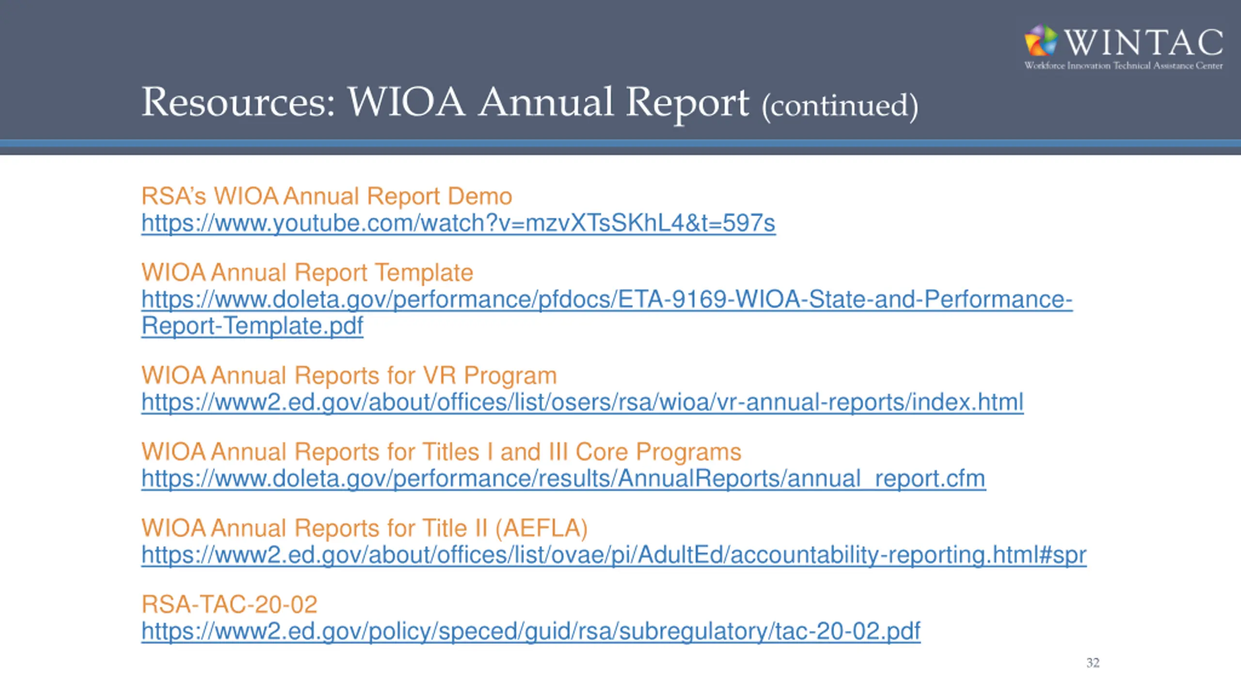 Resources: WIOA Annual Report RSA-PD 16-04 Case Service Report (RSA-911) https://www2.ed.gov/policy/speced/guid/rsa/subregulatory/pd-16-04.pdf RSA-PD 19-03 Case Service Report (RSA-911) https://www2.ed.gov/policy/speced/guid/rsa/subregulatory/pd-19-03.pdf RSA-911 Crosswalk (August 14, 2019) https://www2.ed.gov/rschstat/eval/rehab/case-service-report-rsa-911-crosswalk-of- changes.xlsx RSA TAC 17-01 https://www2.ed.gov/policy/speced/guid/rsa/subregulatory/tac-17- 01.pdf?utm_content=&utm_medium=email&utm_name=&utm_source=govdelivery&ut m_term= WIOA Performance Reporting ETA Website https://www.doleta.gov/performance/reporting/eta_default.cfm 31