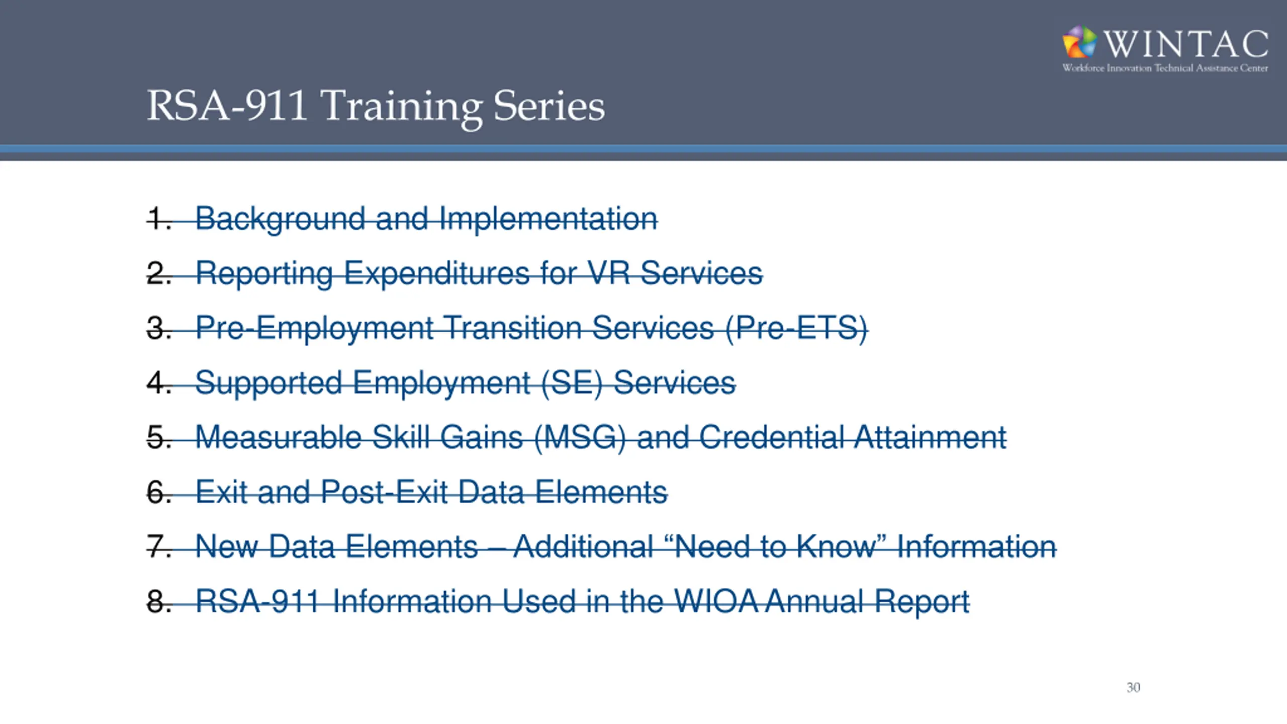 RSA-911 Training Series 1. Background and Implementation 2. Reporting Expenditures for VR Services 3. Pre-Employment Transition Services (Pre-ETS) 4. Supported Employment (SE) Services 5. Measurable Skill Gains (MSG) and Credential Attainment 6. Exit and Post-Exit Data Elements 7. New Data Elements Additional Need to Know Information 8. RSA-911 Information Used in the WIOA Annual Report 30