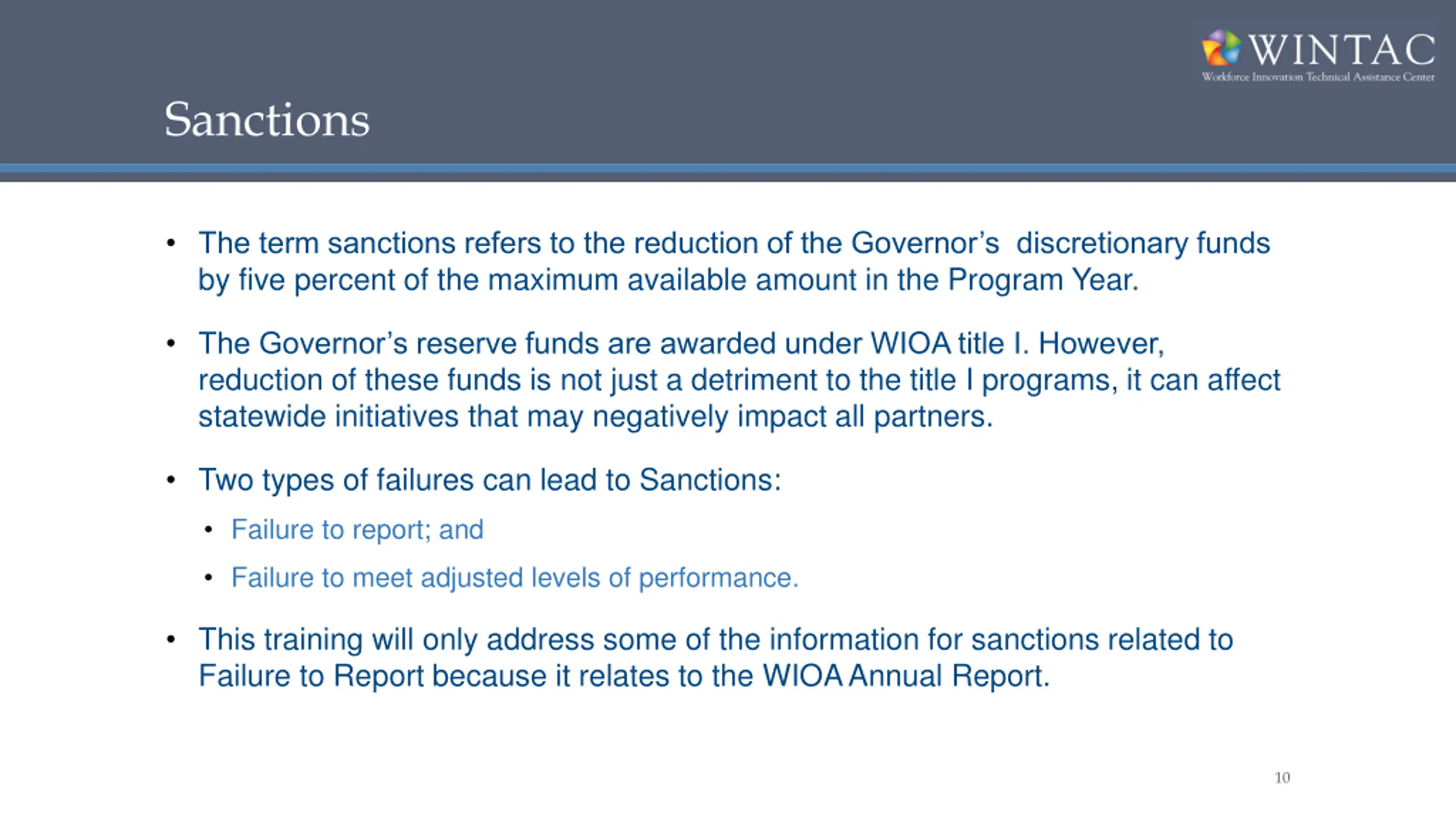 Sanctions The term sanctions refers to the reduction of the Governor s discretionary funds by five percent of the maximum available amount in the Program Year. The Governor s reserve funds are awarded under WIOA title I. However, reduction of these funds is not just a detriment to the title I programs, it can affect statewide initiatives that may negatively impact all partners. Two types of failures can lead to Sanctions: Failure to report; and Failure to meet adjusted levels of performance. This training will only address some of the information for sanctions related to Failure to Report because it relates to the WIOA Annual Report. 10