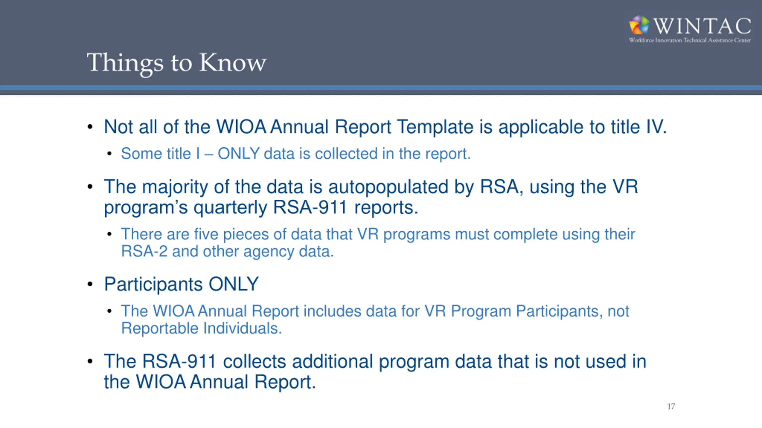 Things to Know Not all of the WIOA Annual Report Template is applicable to title IV. Some title I ONLY data is collected in the report. The majority of the data is autopopulated by RSA, using the VR program s quarterly RSA-911 reports. There are five pieces of data that VR programs must complete using their RSA-2 and other agency data. Participants ONLY The WIOA Annual Report includes data for VR Program Participants, not Reportable Individuals. The RSA-911 collects additional program data that is not used in the WIOA Annual Report. 17