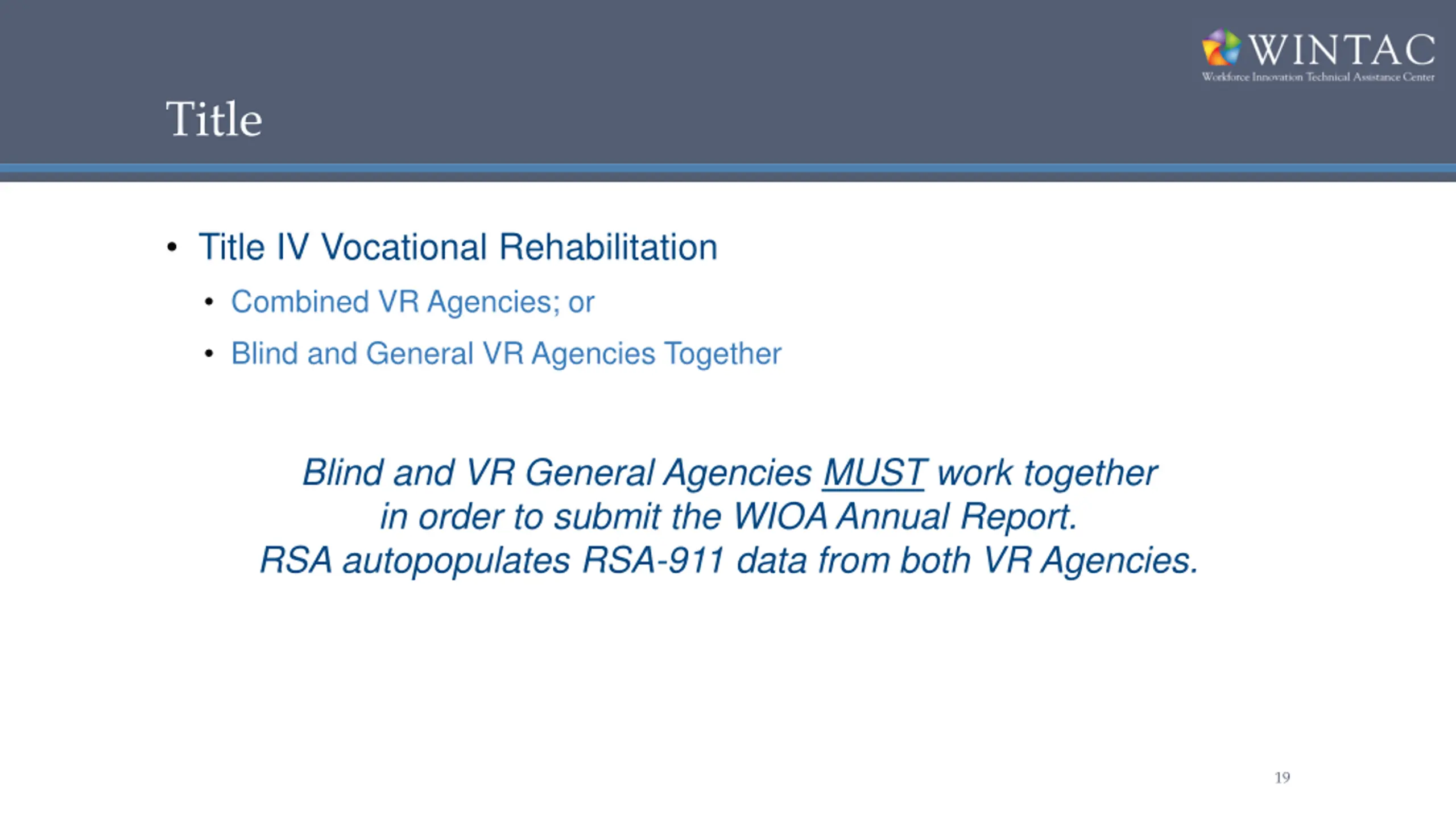 Title Title IV Vocational Rehabilitation Combined VR Agencies; or Blind and General VR Agencies Together Blind and VR General Agencies MUST work together in order to submit the WIOA Annual Report. RSA autopopulates RSA-911 data from both VR Agencies. 19