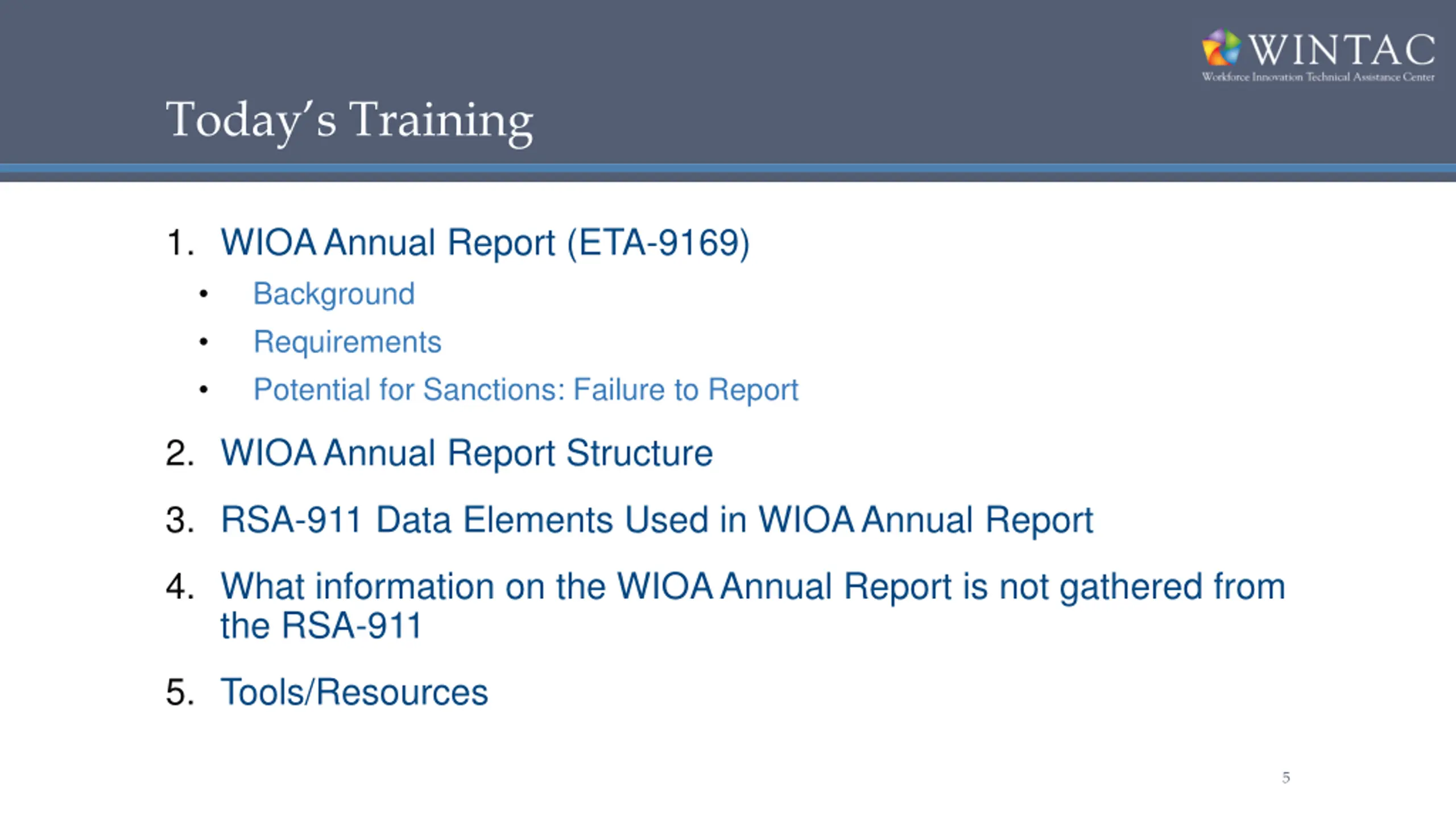 Todays Training 1. WIOA Annual Report (ETA-9169) Background Requirements Potential for Sanctions: Failure to Report 2. WIOA Annual Report Structure 3. RSA-911 Data Elements Used in WIOA Annual Report 4. What information on the WIOA Annual Report is not gathered from the RSA-911 5. Tools/Resources 5