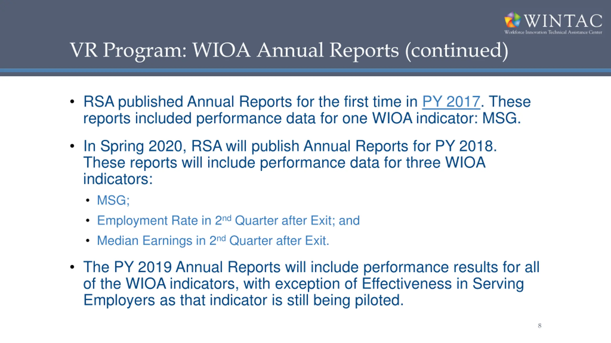 VR Program: WIOA Annual Reports (continued) RSA published Annual Reports for the first time in PY 2017. These reports included performance data for one WIOA indicator: MSG. In Spring 2020, RSA will publish Annual Reports for PY 2018. These reports will include performance data for three WIOA indicators: MSG; Employment Rate in 2nd Quarter after Exit; and Median Earnings in 2nd Quarter after Exit. The PY 2019 Annual Reports will include performance results for all of the WIOA indicators, with exception of Effectiveness in Serving Employers as that indicator is still being piloted. 8