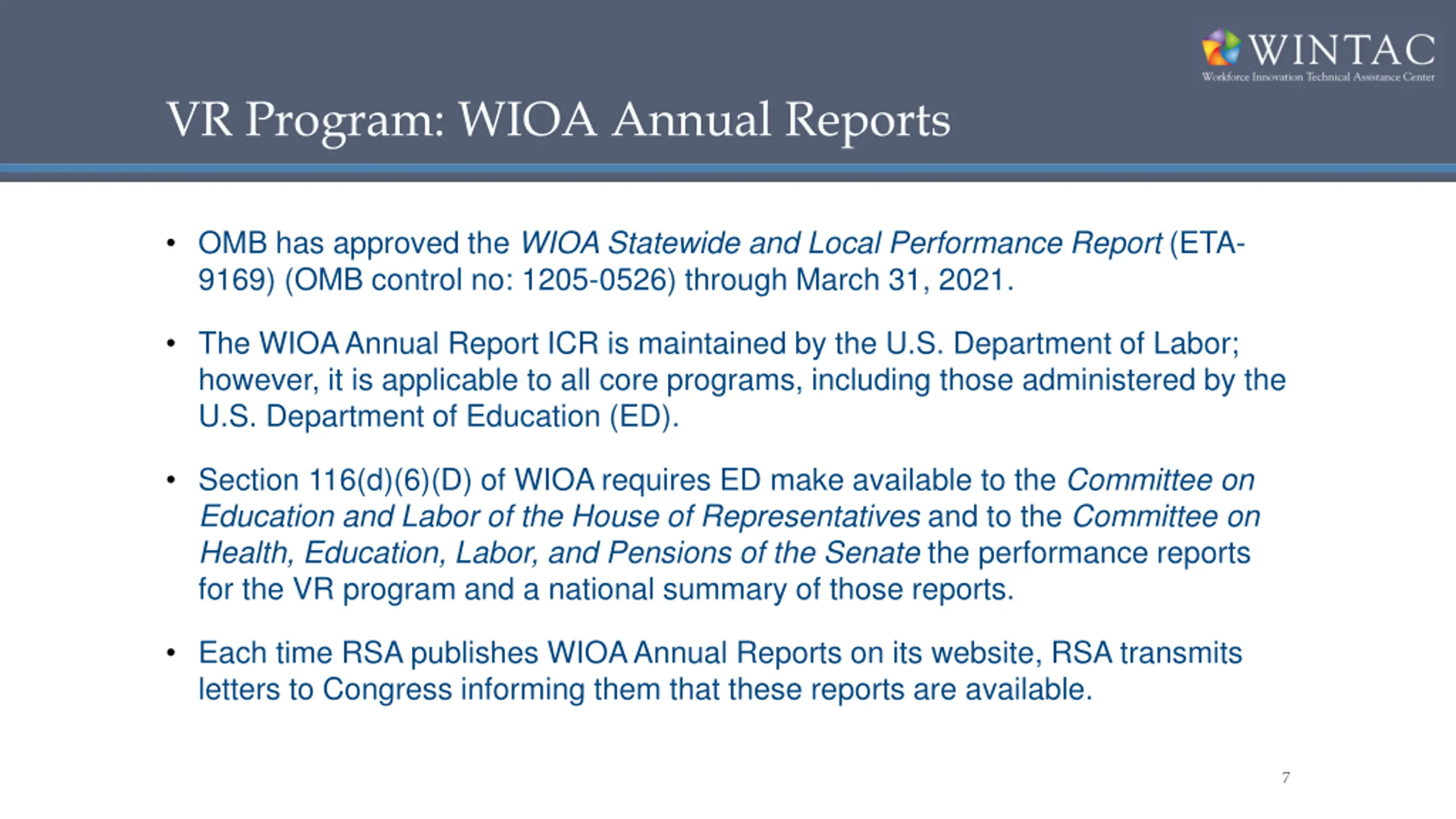 VR Program: WIOA Annual Reports OMB has approved the WIOA Statewide and Local Performance Report (ETA- 9169) (OMB control no: 1205-0526) through March 31, 2021. The WIOA Annual Report ICR is maintained by the U.S. Department of Labor; however, it is applicable to all core programs, including those administered by the U.S. Department of Education (ED). Section 116(d)(6)(D) of WIOA requires ED make available to the Committee on Education and Labor of the House of Representatives and to the Committee on Health, Education, Labor, and Pensions of the Senate the performance reports for the VR program and a national summary of those reports. Each time RSA publishes WIOA Annual Reports on its website, RSA transmits letters to Congress informing them that these reports are available. 7
