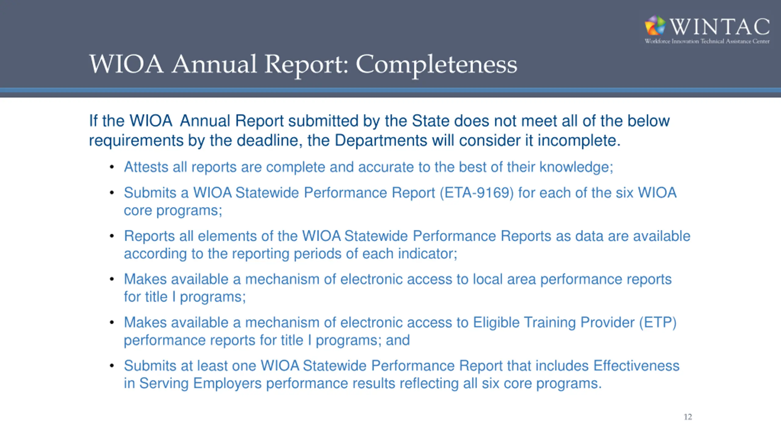 WIOA Annual Report: Completeness If the WIOA Annual Report submitted by the State does not meet all of the below requirements by the deadline, the Departments will consider it incomplete. Attests all reports are complete and accurate to the best of their knowledge; Submits a WIOA Statewide Performance Report (ETA-9169) for each of the six WIOA core programs; Reports all elements of the WIOA Statewide Performance Reports as data are available according to the reporting periods of each indicator; Makes available a mechanism of electronic access to local area performance reports for title I programs; Makes available a mechanism of electronic access to Eligible Training Provider (ETP) performance reports for title I programs; and Submits at least one WIOA Statewide Performance Report that includes Effectiveness in Serving Employers performance results reflecting all six core programs. 12