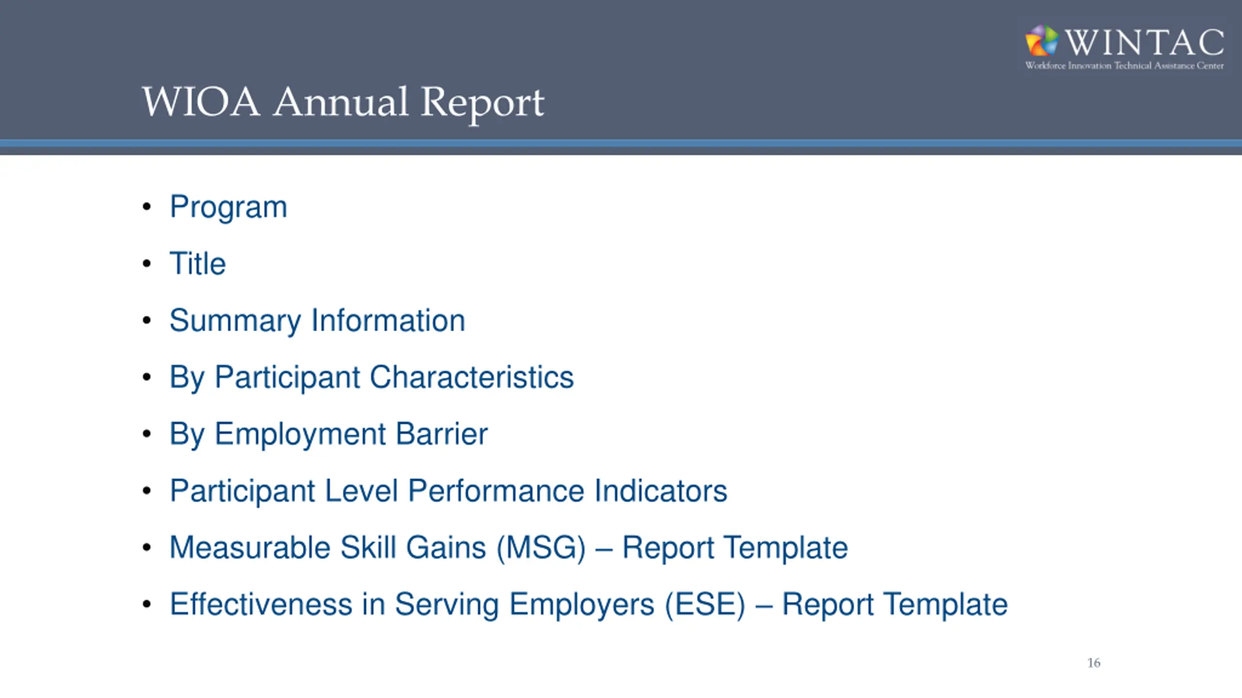WIOA Annual Report Program Title Summary Information By Participant Characteristics By Employment Barrier Participant Level Performance Indicators Measurable Skill Gains (MSG) Report Template Effectiveness in Serving Employers (ESE) Report Template 16