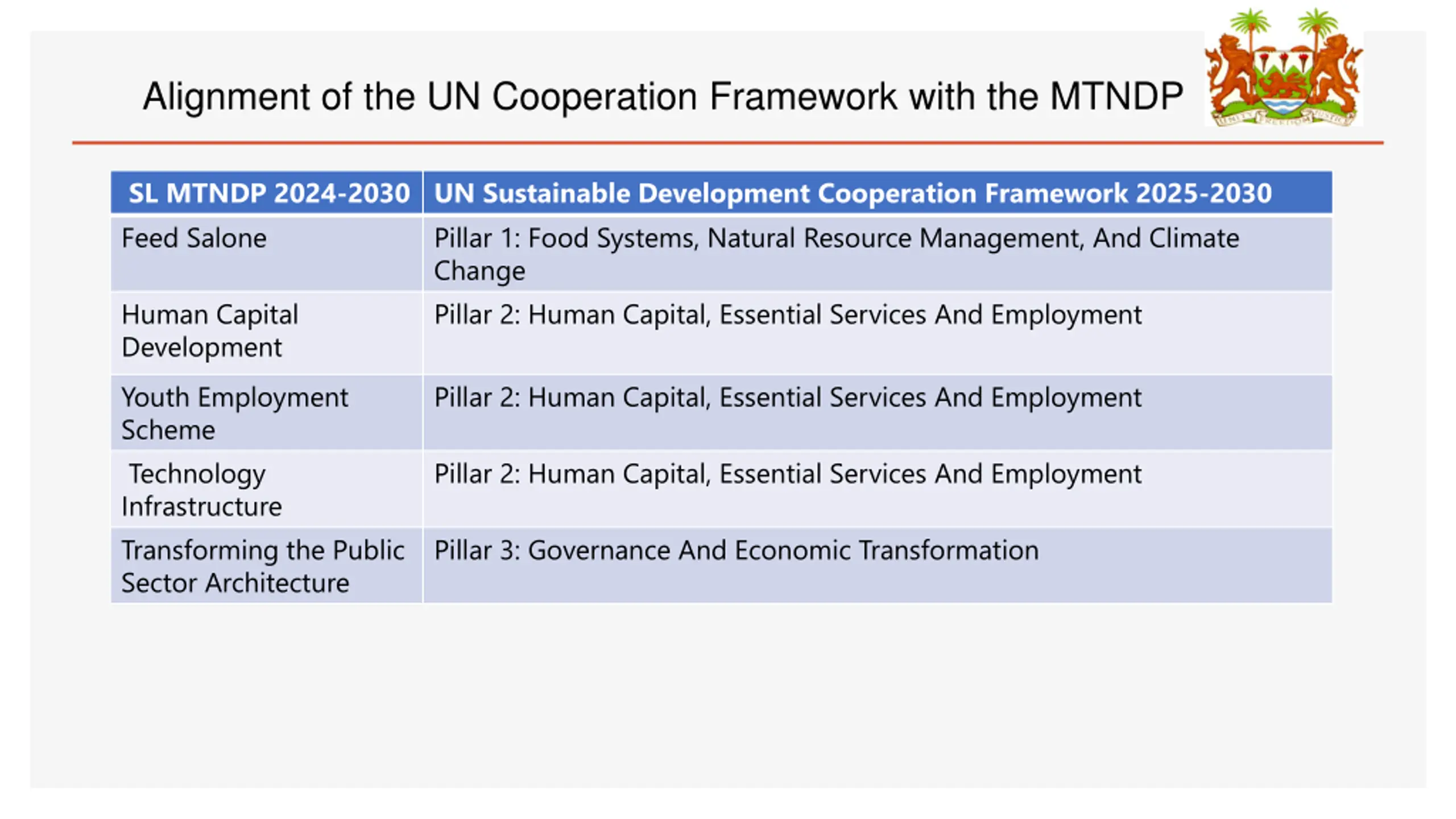 Alignment of the UN Cooperation Framework with the MTNDP SL MTNDP 2024-2030 UN Sustainable Development Cooperation Framework 2025-2030 Feed Salone Pillar 1: Food Systems, Natural Resource Management, And Climate Change Human Capital Development Youth Employment Scheme Technology Infrastructure Transforming the Public Sector Architecture Pillar 2: Human Capital, Essential Services And Employment Pillar 2: Human Capital, Essential Services And Employment Pillar 2: Human Capital, Essential Services And Employment Pillar 3: Governance And Economic Transformation