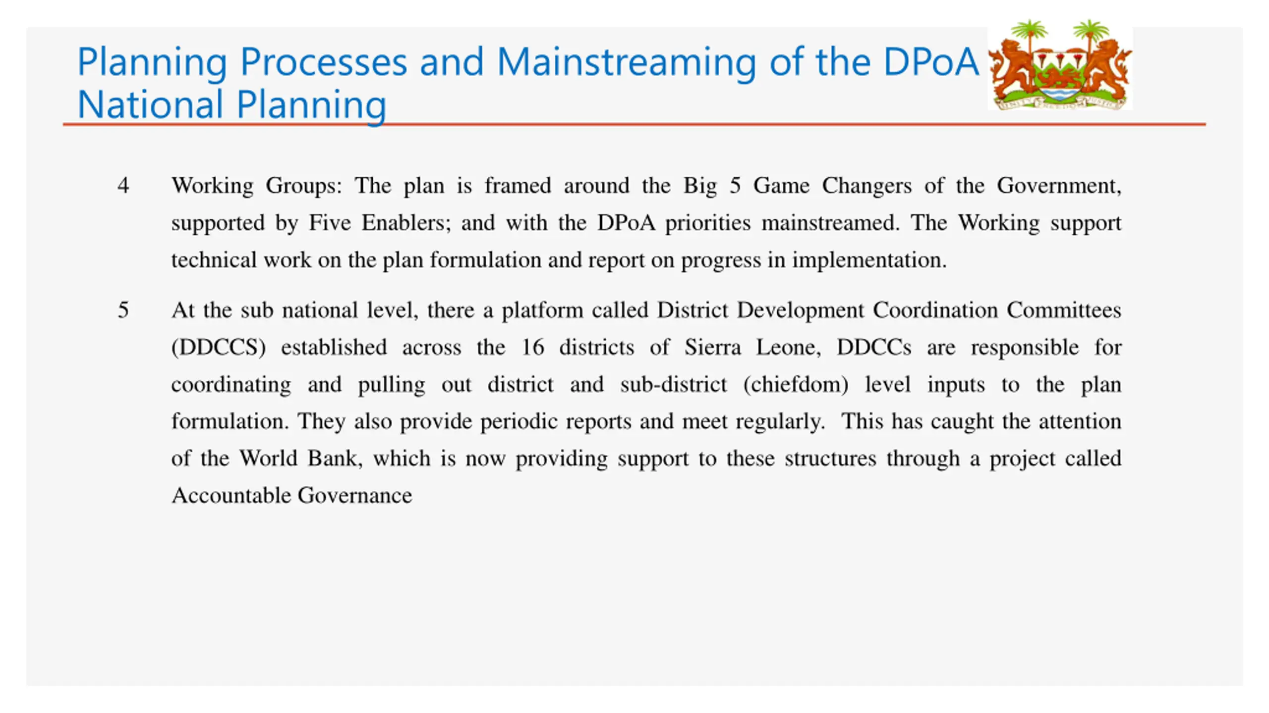 Planning Processes and Mainstreaming of the DPoA in National Planning 4 Working Groups: The plan is framed around the Big 5 Game Changers of the Government, supported by Five Enablers; and with the DPoA priorities mainstreamed. The Working support technical work on the plan formulation and report on progress in implementation. 5 At the sub national level, there a platform called District Development Coordination Committees (DDCCS) established across the 16 districts of Sierra Leone, DDCCs are responsible for coordinating and pulling out district and sub-district (chiefdom) level inputs to the plan formulation. They also provide periodic reports and meet regularly. This has caught the attention of the World Bank, which is now providing support to these structures through a project called Accountable Governance