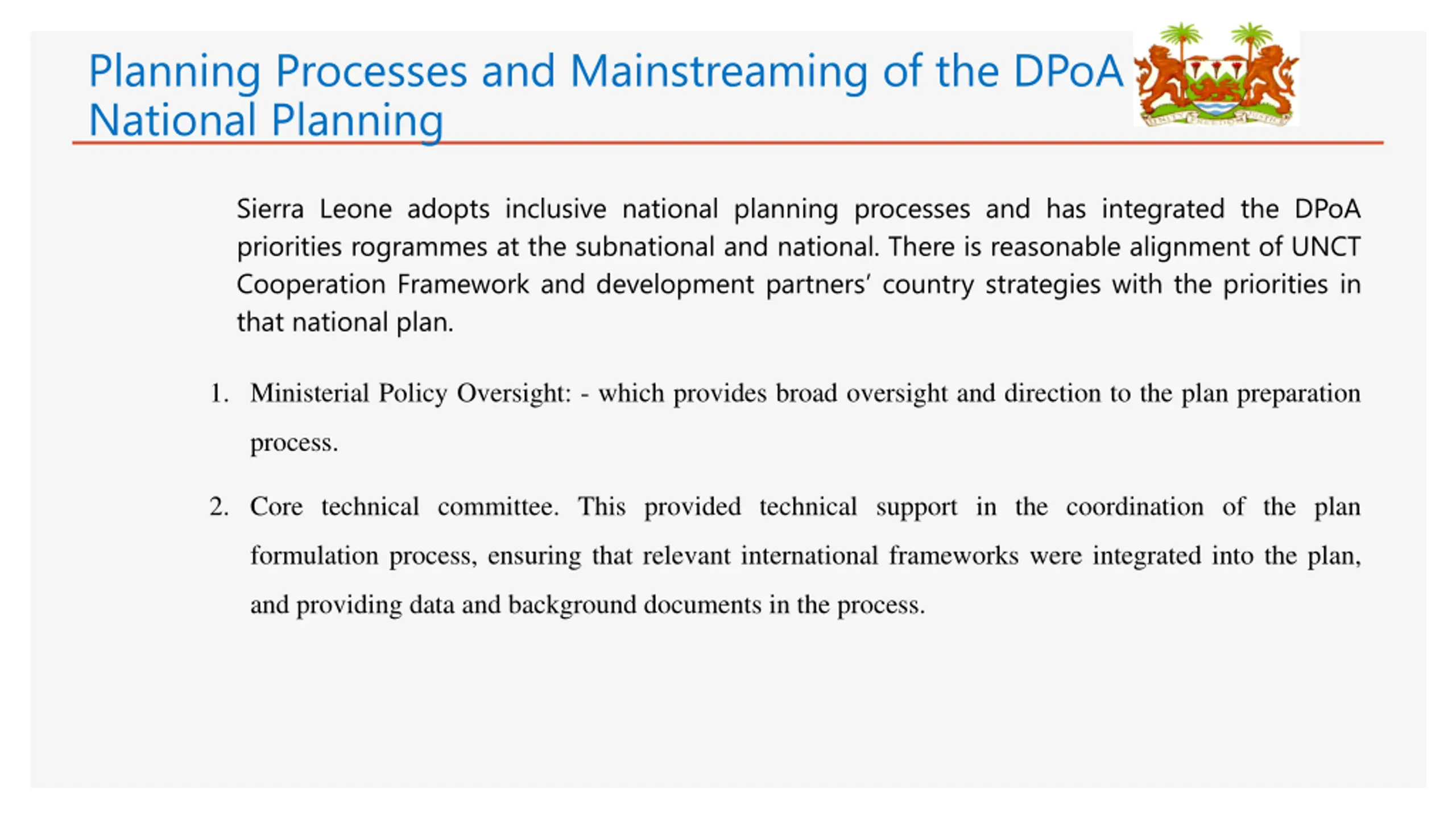 Planning Processes and Mainstreaming of the DPoA in National Planning Sierra Leone adopts inclusive national planning processes and has integrated the DPoA priorities rogrammes at the subnational and national. There is reasonable alignment of UNCT Cooperation Framework and development partners country strategies with the priorities in that national plan. 1. Ministerial Policy Oversight: - which provides broad oversight and direction to the plan preparation process. 2. Core technical committee. This provided technical support in the coordination of the plan formulation process, ensuring that relevant international frameworks were integrated into the plan, and providing data and background documents in the process.