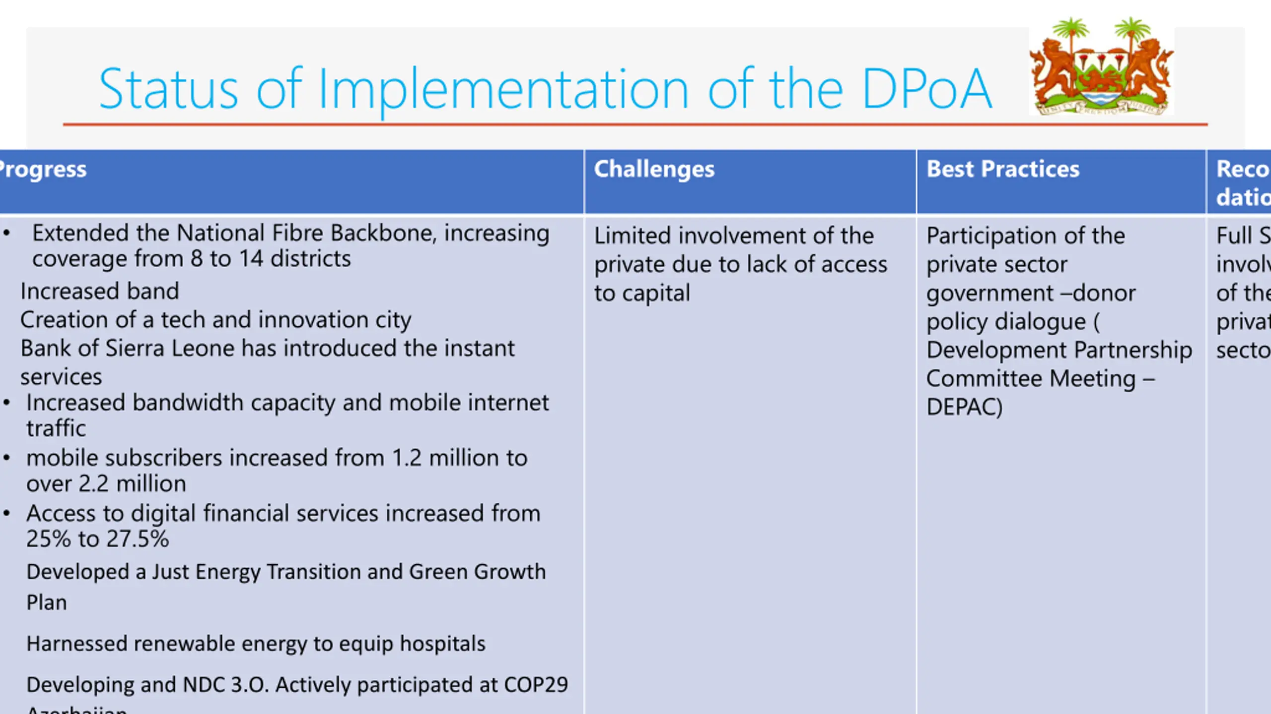 Status of Implementation of the DPoA Progress Challenges Best Practices Recommen dation Full Scale involvement of the private sector Extended the National Fibre Backbone, increasing coverage from 8 to 14 districts Increased band Creation of a tech and innovation city Bank of Sierra Leone has introduced the instant services Increased bandwidth capacity and mobile internet traffic mobile subscribers increased from 1.2 million to over 2.2 million Access to digital financial services increased from 25% to 27.5% Developed a Just Energy Transition and Green Growth Plan Limited involvement of the private due to lack of access to capital Participation of the private sector government donor policy dialogue ( Development Partnership Committee Meeting DEPAC) Harnessed renewable energy to equip hospitals Developing and NDC 3.O. Actively participated at COP29 Azerbaijan
