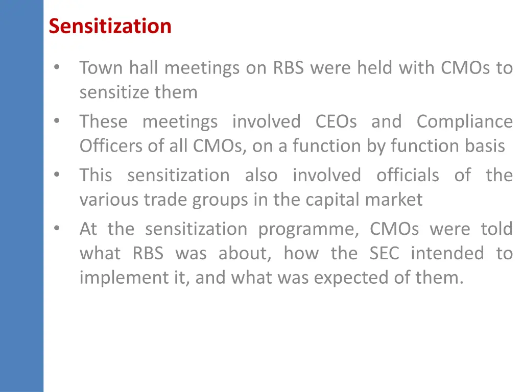 Sensitization Town hall meetings on RBS were held with CMOs to sensitize them These meetings involved CEOs and Compliance Officers of all CMOs, on a function by function basis This sensitization also involved officials of the various trade groups in the capital market At the sensitization programme, CMOs were told what RBS was about, how the SEC intended to implement it, and what was expected of them.