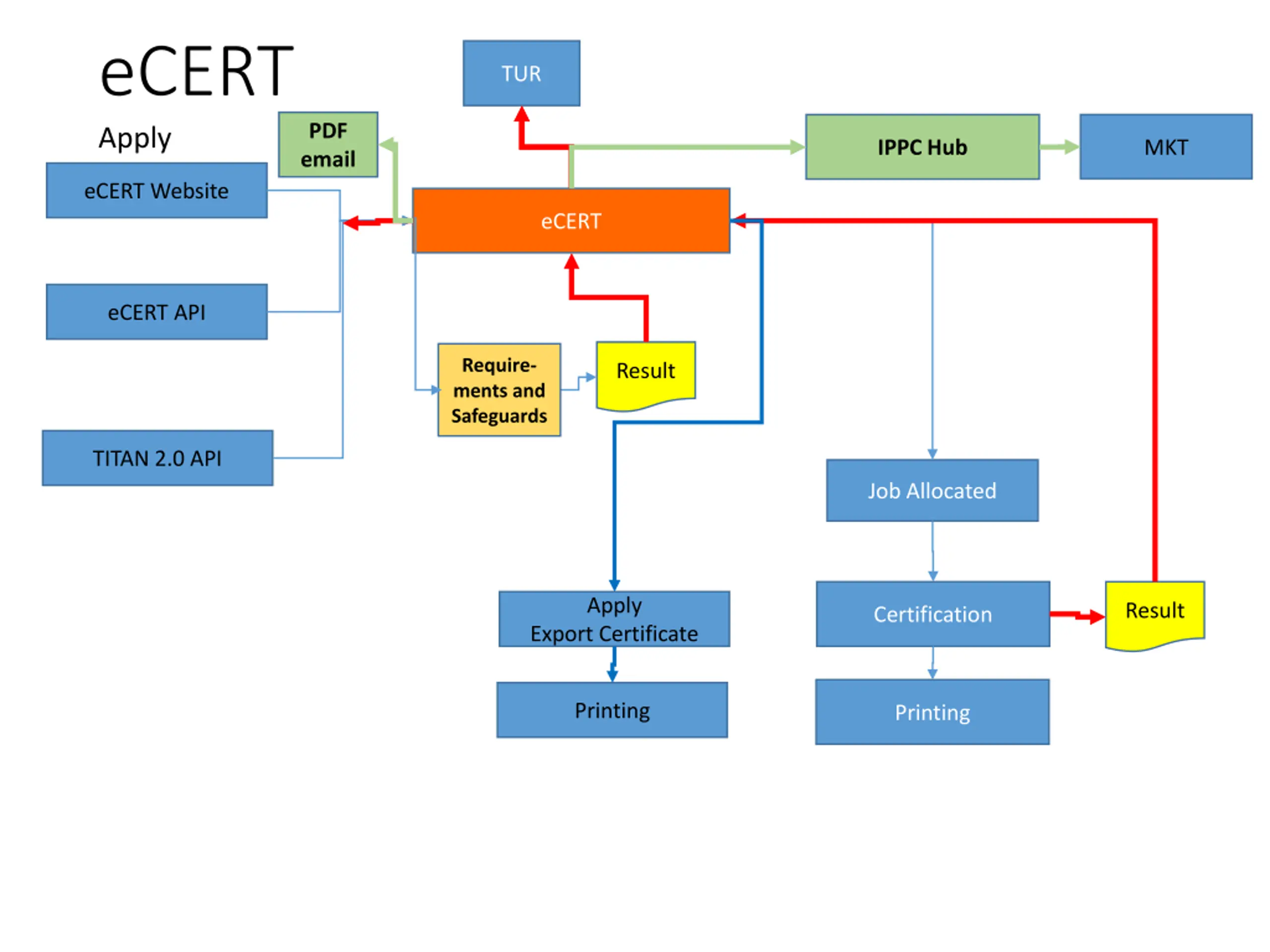 eCERT Apply TUR PDF email MKT IPPC Hub eCERT Website eCERT eCERT API Require- ments and Safeguards Result TITAN 2.0 API Job Allocated Apply Result Certification Export Certificate Printing Printing