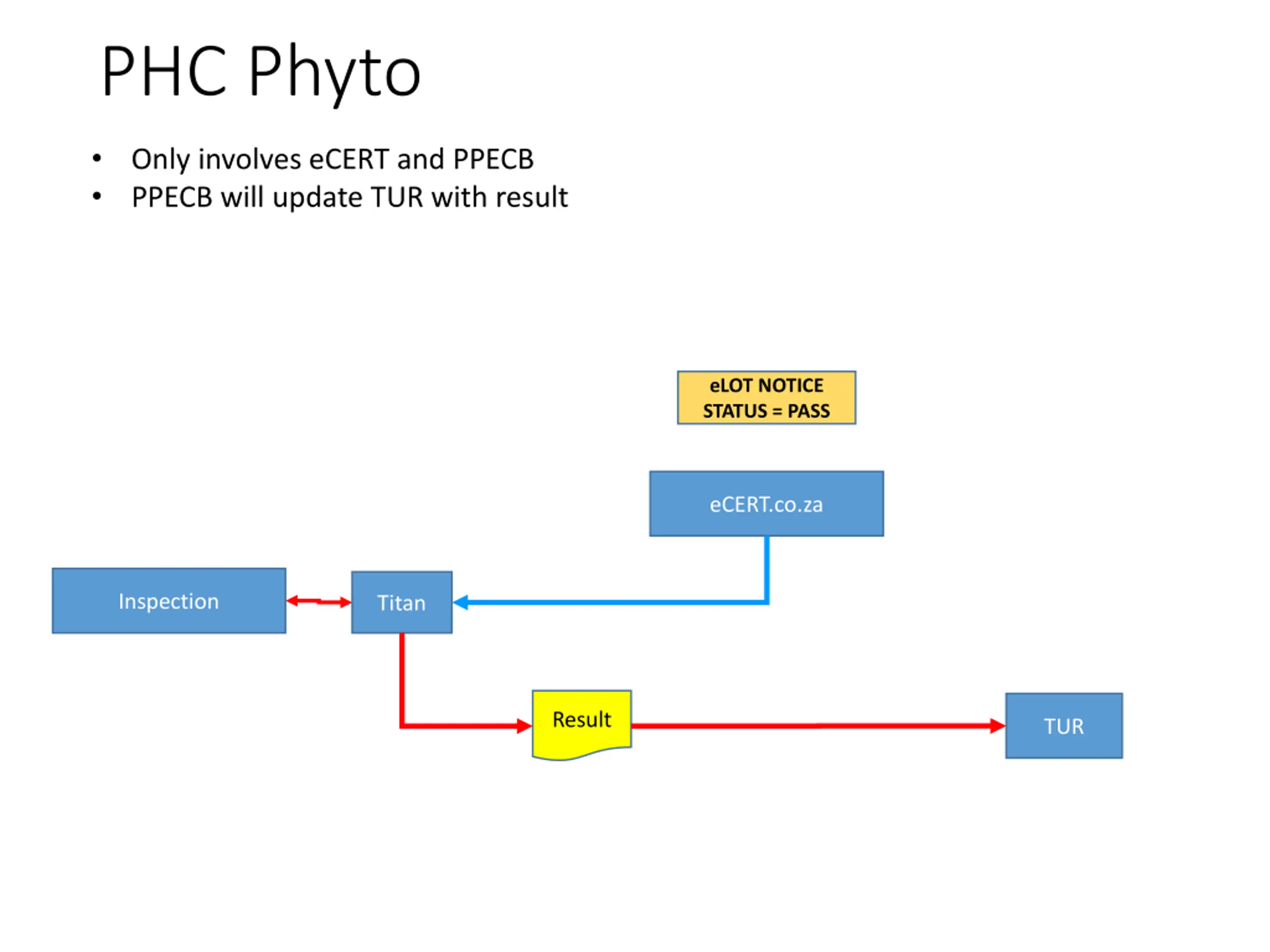 PHC Phyto Only involves eCERT and PPECB PPECB will update TUR with result eLOT NOTICE STATUS = PASS eCERT.co.za Inspection Titan Result TUR