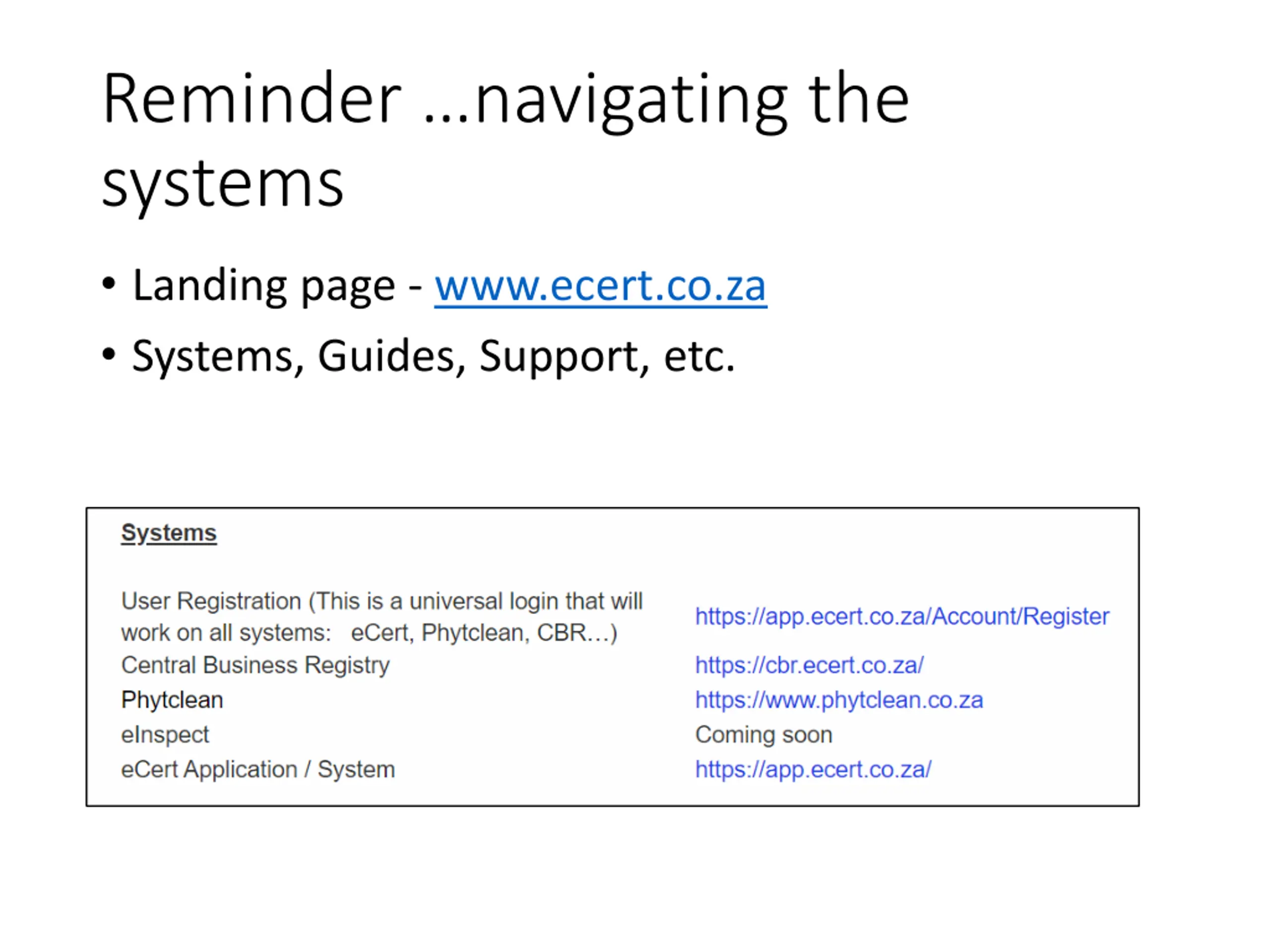 Reminder navigating the systems Landing page - www.ecert.co.za Systems, Guides, Support, etc.