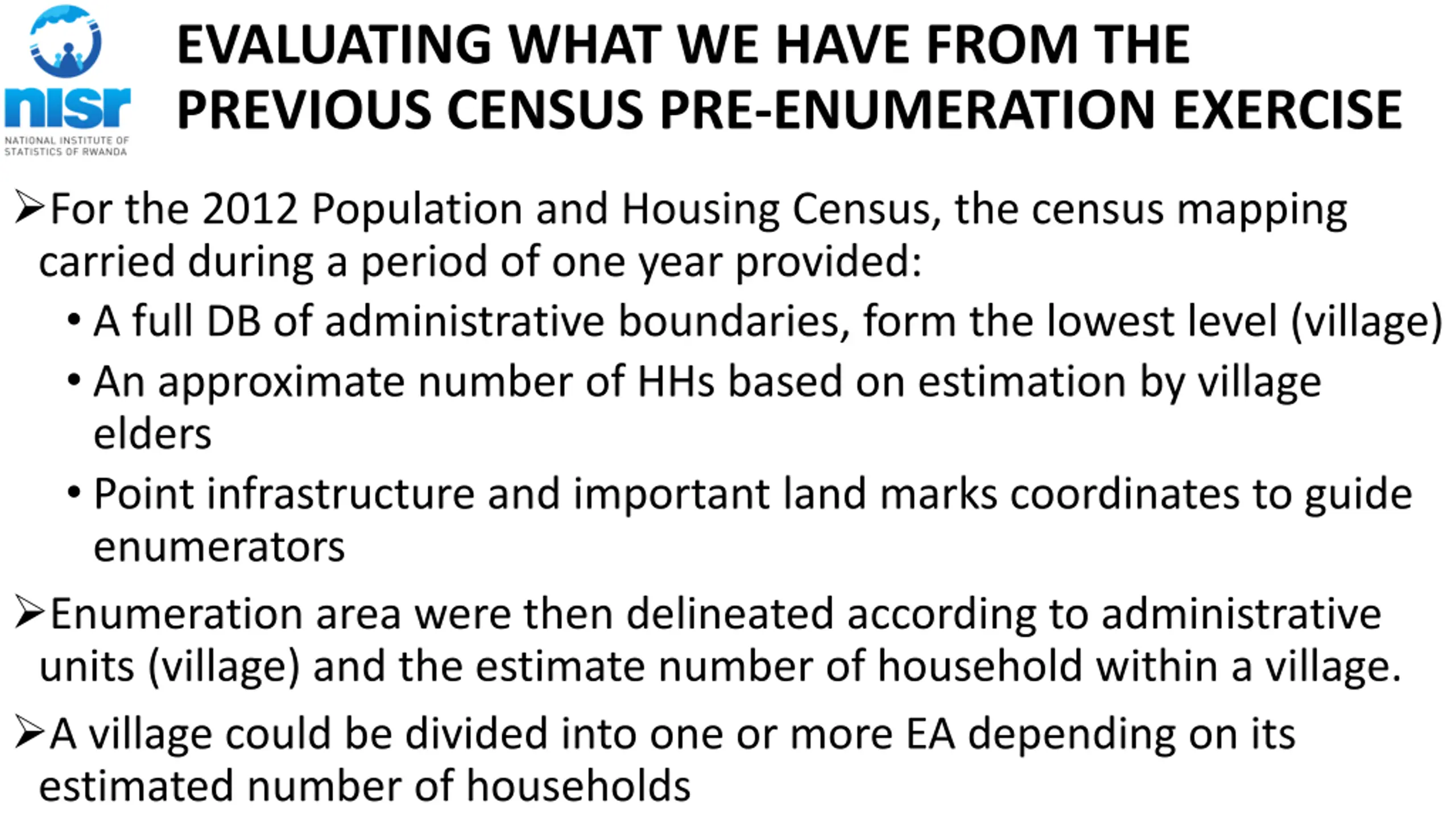 EVALUATING WHAT WE HAVE FROM THE PREVIOUS CENSUS PRE-ENUMERATION EXERCISE For the 2012 Population and Housing Census, the census mapping carried during a period of one year provided: A full DB of administrative boundaries, form the lowest level (village) An approximate number of HHs based on estimation by village elders Point infrastructure and important land marks coordinates to guide enumerators Enumeration area were then delineated according to administrative units (village) and the estimate number of household within a village. A village could be divided into one or more EA depending on its estimated number of households