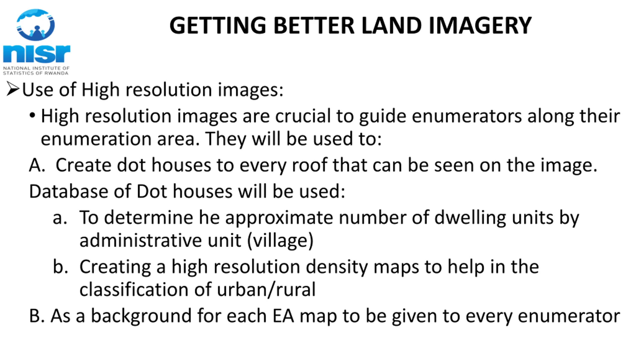 GETTING BETTER LAND IMAGERY Use of High resolution images: High resolution images are crucial to guide enumerators along their enumeration area. They will be used to: A. Create dot houses to every roof that can be seen on the image. Database of Dot houses will be used: a. To determine he approximate number of dwelling units by administrative unit (village) b. Creating a high resolution density maps to help in the classification of urban/rural B. As a background for each EA map to be given to every enumerator