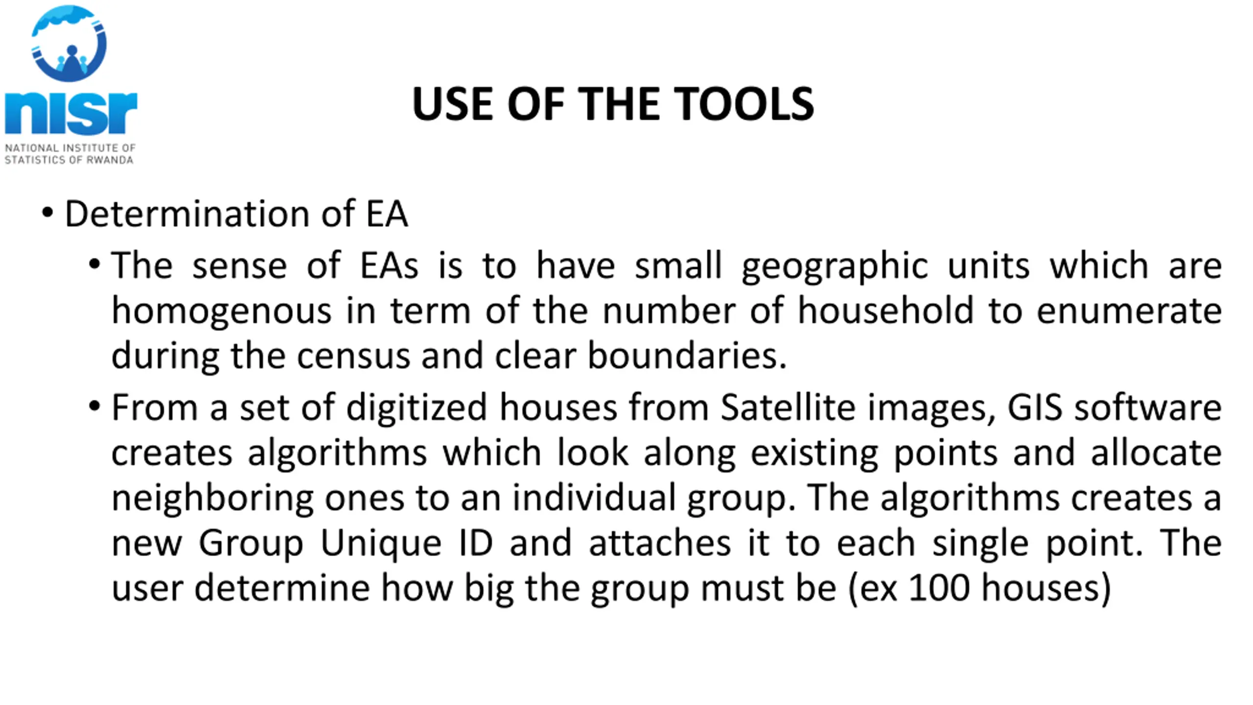USE OF THE TOOLS Determination of EA The sense of EAs is to have small geographic units which are homogenous in term of the number of household to enumerate during the census and clear boundaries. From a set of digitized houses from Satellite images, GIS software creates algorithms which look along existing points and allocate neighboring ones to an individual group. The algorithms creates a new Group Unique ID and attaches it to each single point. The user determine how big the group must be (ex 100 houses)